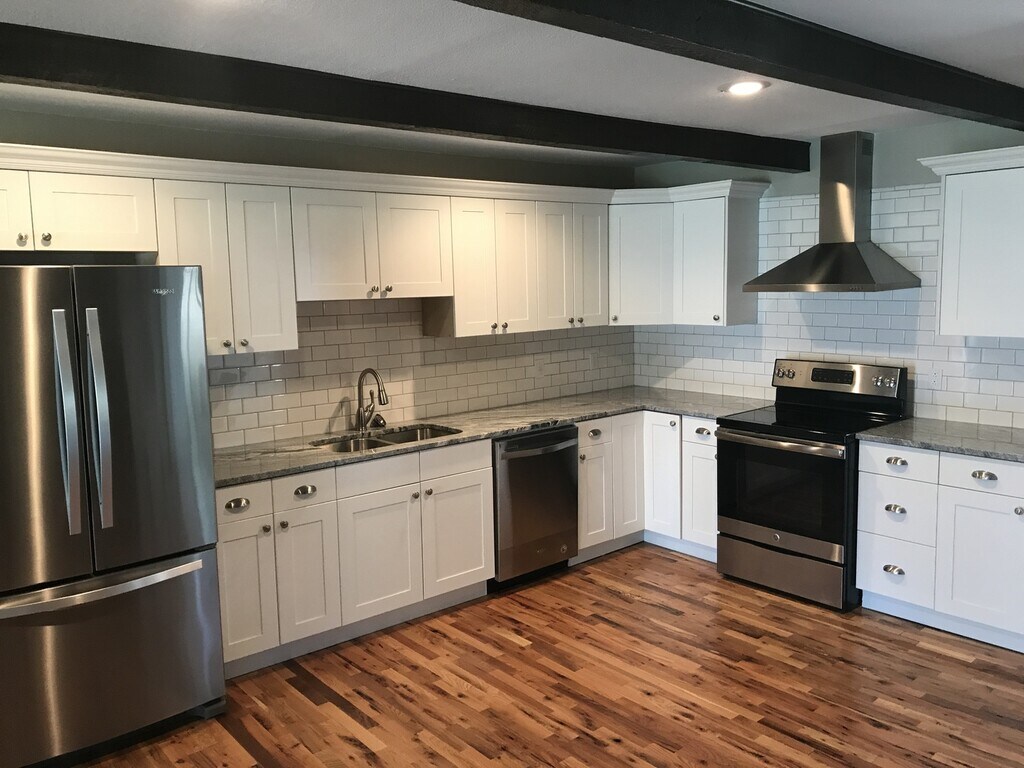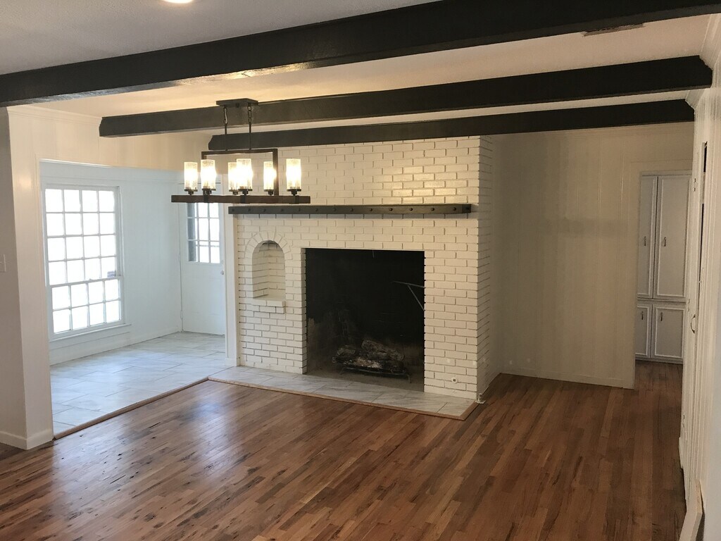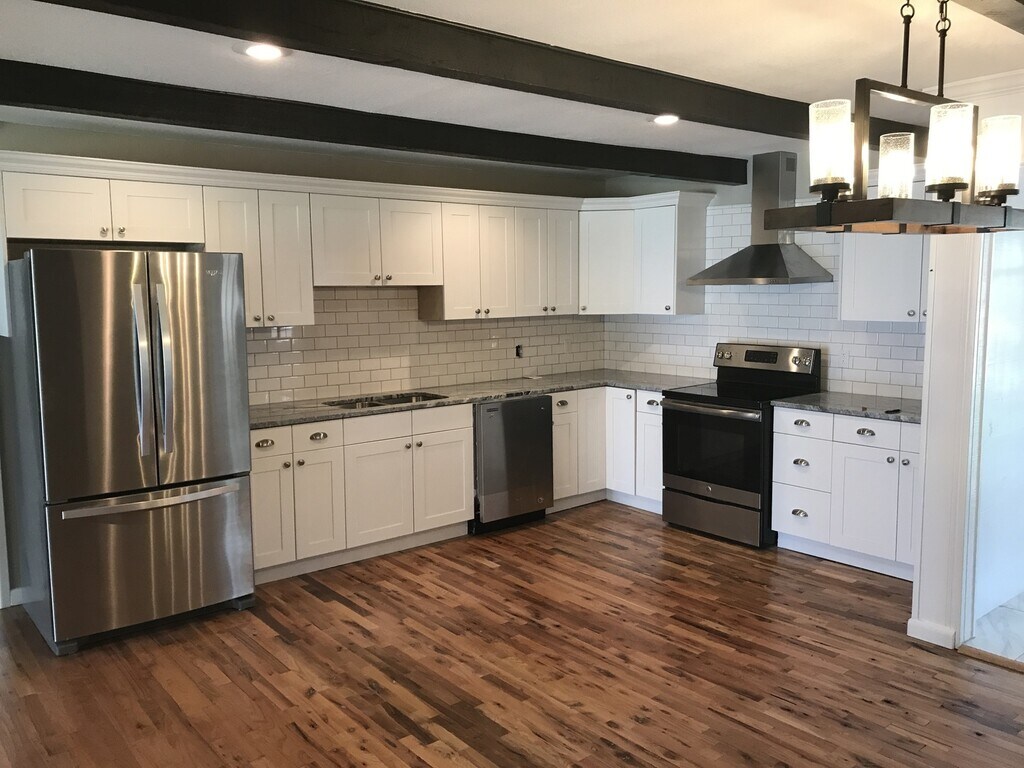 Gorgeous kitchen with hardwood floors and a fireplace. This spacious 4 bed 2 bath home has hardwood floors throughout! Large bedrooms, new tile and double vanities in the bathrooms. New cabinets and granite kitchen counters. Enclosed laundry room. All stainless appliances included, all maintenance included. Available to pre-lease for this fall!