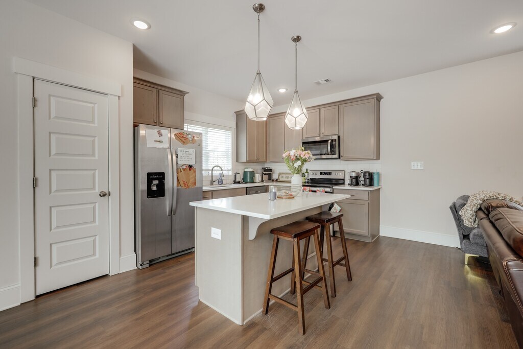 Pre leasing now for August 1 2026 move in. $3400/mo. This recently constructed single family home has 5 bedrooms and 4 full bathrooms. The house is 3 stories, with three bedrooms upstairs, one main floor bedroom, and a private downstairs bedroom and second den that lives like it's own separate apartment. The comfortable main floor opens to an open living room connected to a well equipped kitchen and eat in kitchen area. Enjoy the covered front rocking chair front porch and the private back patio. Plenty of off street parking behind the house in the paved parking area. Enjoy the student oriented development and convenient in town location just minutes from downtown Athens and UGA. Washer and dryer provided by Owner. Landscape maintenance and pest control included. Visit heartpinepm dot com to complete your rental application and schedule your tour. Professionally managed.