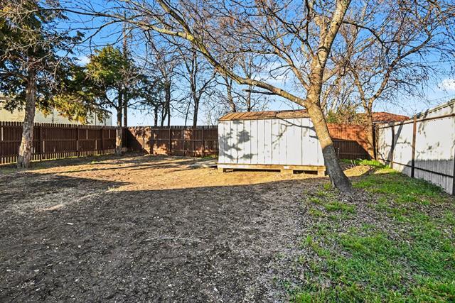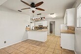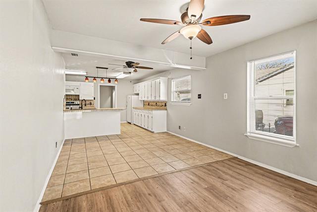 Spacious single story home featuring an open living and dining area with wood look flooring and neutral paint throughout. Kitchen offers extensive cabinetry, tile countertops, breakfast bar with sink, and included appliances. Bedrooms are generously sized and include ceiling fans and ample closet space. Bathrooms feature tile tub and shower surrounds and practical storage. Additional features include a dedicated utility and laundry area, built in storage, and updated lighting fixtures. Exterior includes a fenced backyard with mature trees and storage buildings providing additional storage space. Convenient access to shopping, dining, and major thoroughfares.