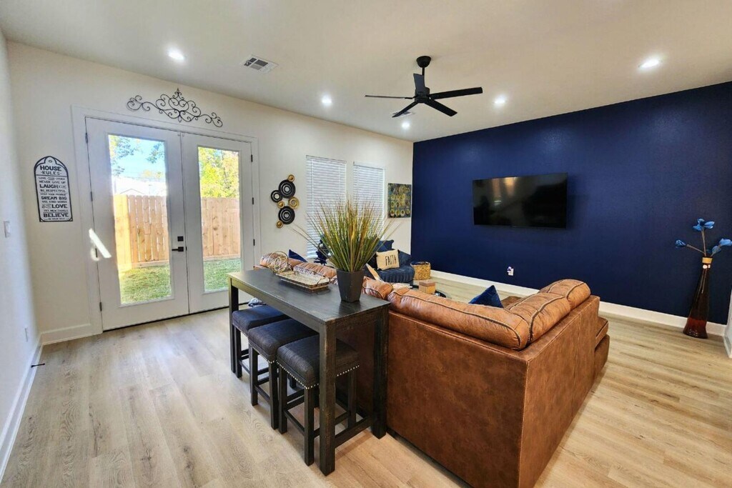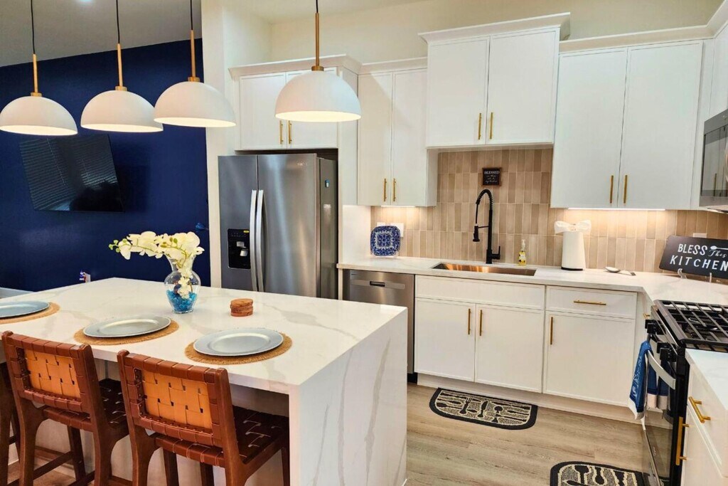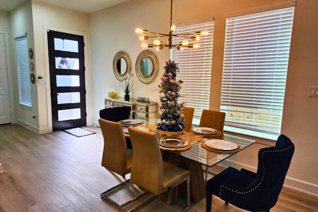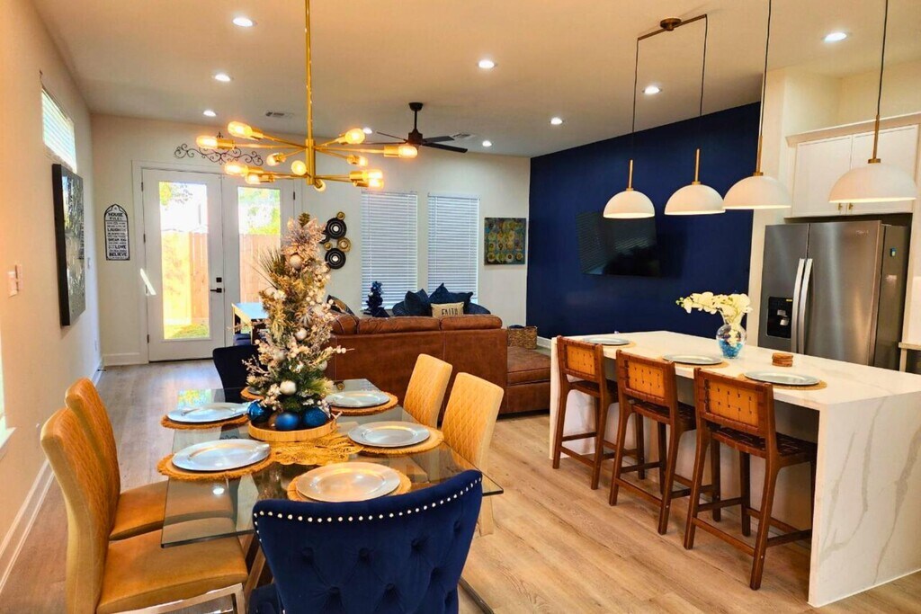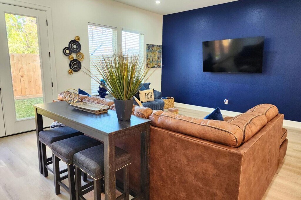 Escape to this beautifully designed modern farmhouse near Houston’s Medical Center and Downtown. This 3BR, 3.5BA home features a chef’s kitchen with a waterfall island, open living and dining spaces, and a second-floor lounge with a wet bar. The spacious primary suite offers high ceilings, a soaking tub, and a walk-in shower. Enjoy smart TVs in every bedroom, high-speed Wi-Fi, and a game room with board games. Outside, relax in the private, fenced backyard or take advantage of the secure 2-car garage. Each bedroom is thoughtfully furnished—king, queen, and twin beds—with air mattresses for extra guests. Located in South Union, you're minutes from top attractions like the Museum District, NRG Stadium, Hermann Park, and major highways. Whether for business or leisure, this home delivers comfort, style, and convenience in one perfect Houston location. Welcome to your modern Houston getaway near the Medical Center, Downtown, and Museum District! This spacious 3BR, 3.5BA home offers ...