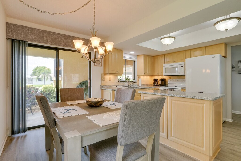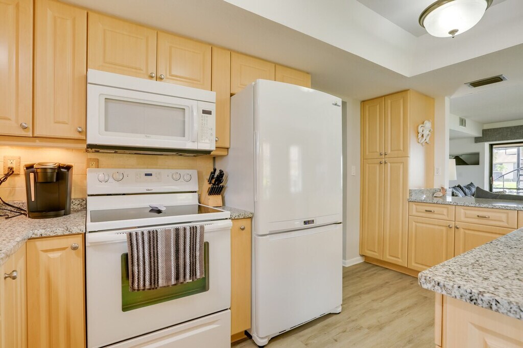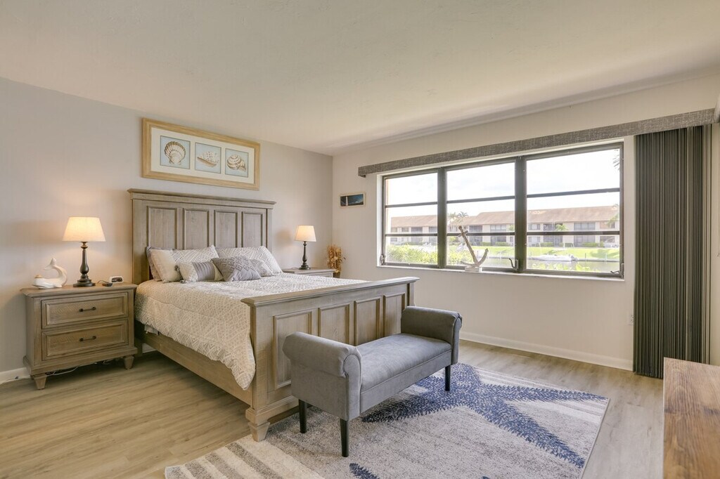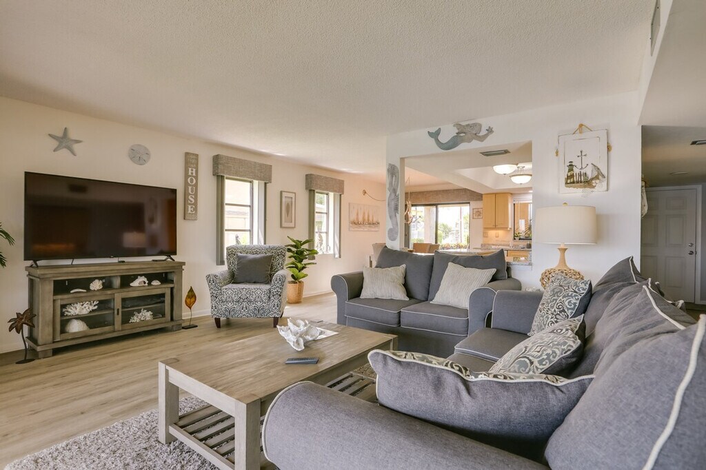 Feel at home in this 2-bedroom, 2-bathroom Cape Coral vacation rental. With step-free access, accessing the condo is a breeze! This fully remodeled apartment features new furniture, sliding glass doors with water views, 2 Smart TVs with cable, a furnished lanai, and outdoor speakers. The kitchen is fully equipped with a blender, Keurig coffee maker, coffee grinder, Crockpot, kitchen knives, flatware and utensils, microwave, toaster, dishwasher, stovetop/oven, pots and pans, and refrigerator. Also provided are 2 bicycles, beach towels, pool toys, and fishing poles. Guests have access to the entire property via keyless entry. Parking is available in the carport for 1 vehicle and in the driveway for 2 vehicles. RVs or trailers are not permitted. Whether you want to take a dip in the community pool or enjoy the water views from the screened-in lanai, this apartment is the place for you. Take the bikes for a spin through the sunny neighborhood or pack up the beach towels for a day at Fort Meyers or one of the many nearby beaches. Smoking, pets, events, parties, and large gatherings are not allowed. Guests must be at least 25 years old to book. Additional fees and taxes may apply, and a photo ID may be required upon check-in. [SI]