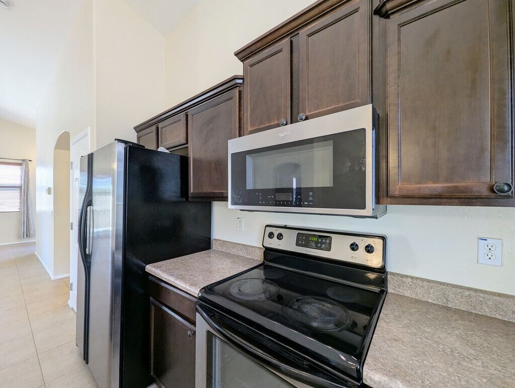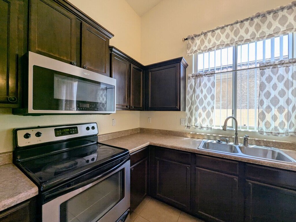 Beautifully updated home in South Mountain Village! Located within the quiet community of Amber Ridge Heights, this single-level house has 1,493 square feet of living space which includes a large living room with vaulted ceilings, three big bedrooms, two full bathrooms, and a lovely kitchen with custom cabinets, upgraded countertops, and stainless steel appliances. The home also has neutral painted walls and tile floors throughout. Great backyard space with a large extended patio. Ideal location near good schools, grocery stores, and easy access to Loop 202. Minutes from lots of shopping, dining options, and Cesar Chavez Park (Basketball Court; Dog Park; Children Playground; Racquetball Court; Skate Park; Tennis Court; Urban Fishing; Volleyball Court).