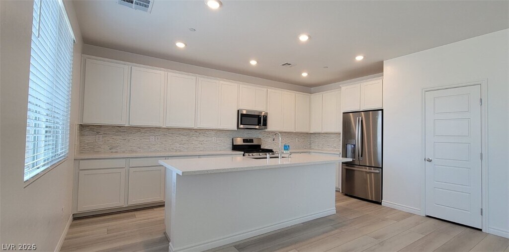 Beautiful property is thoughtfully designed with 4 bedrooms (1 downstairs) and 3 baths. This contemporary home features a gourmet kitchen with a beautiful quartz island buffet, stunning backsplash, GE stainless steel appliances, and a spacious flow from the kitchen to the family room, perfect for entertaining. Open-concept kitchen, living space, bathrooms, and hallways all feature contemporary luxury (wide-plank) vinyl flooring. The upstairs owner's suite is spacious and has 2 large walk-in closets. Two bedrooms upstairs are connected by a Jack & Jill bathroom with dual sinks. One bedroom downstairs can be used for a study or an extra bedroom. All bathrooms have cultured quartz countertops. This home has all the modern security and energy efficiency amenities, including solar panels, a Ring Alarm Security System, and a Ring Video Doorbell Pro. Every room has a pre-wired TV and a security network built in, ideal for working from home. The backyard is well-designed for entertainment.