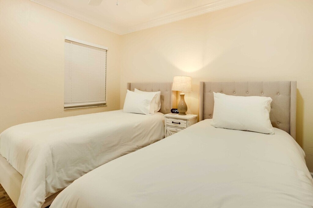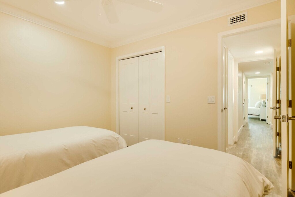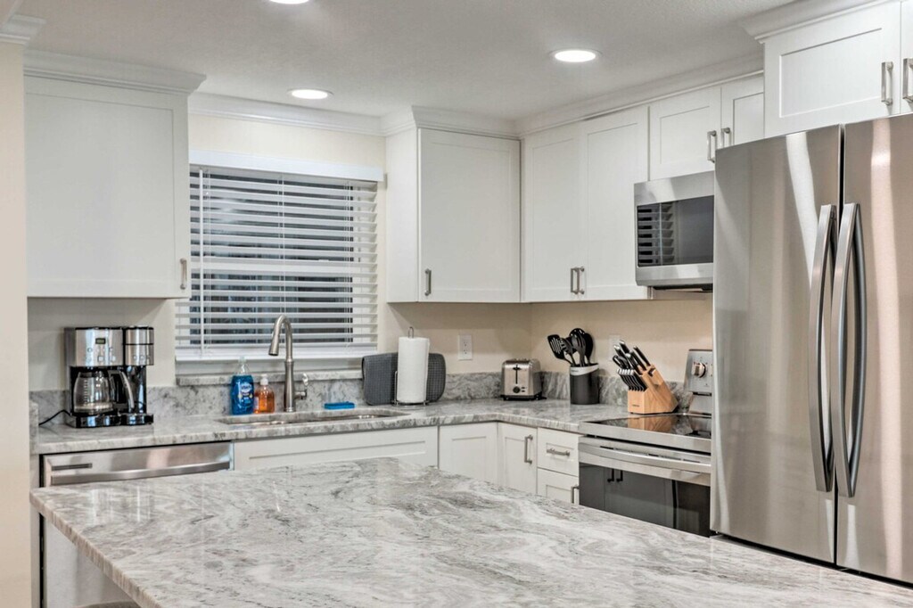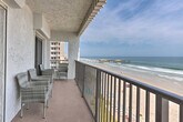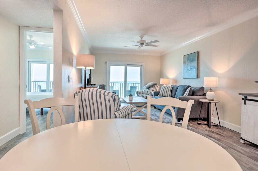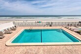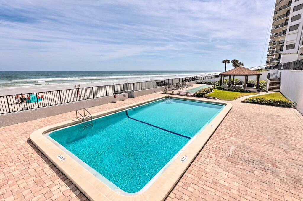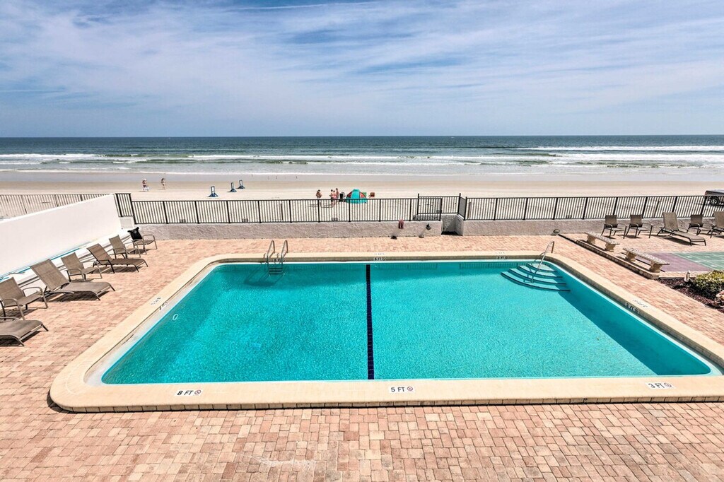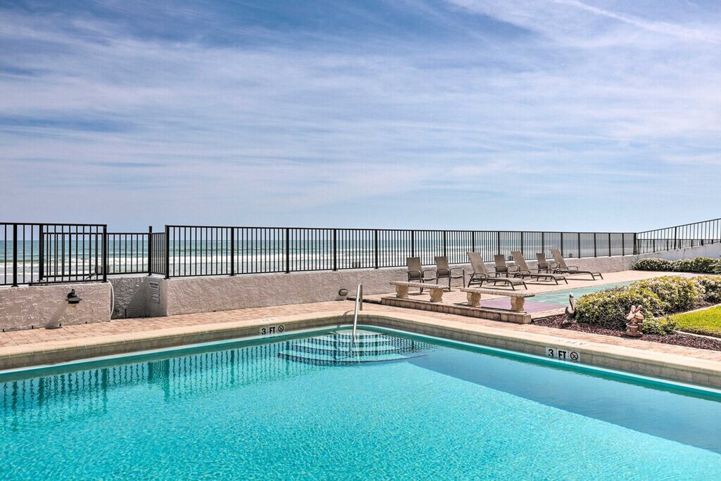 Feel at home in this updated 2-bedroom, 2-bath condo nestled on Daytona Beach Shores. This 5th-story condo is accessible by elevator. This condo boasts a modern coastal interior, a pristine fully equipped kitchen with stainless steel appliances and granite countertops, and 2 Smart TVs with cable. The kitchen also includes cooking basics, a drip coffee maker, a knife set, and a breakfast bar. Linens, towels, complimentary toiletries, beach chairs, shuffleboard sticks, disks, and a bocce ball are provided. Central air conditioning and heating, as well as a washer and dryer, are included for your convenience. Parking is available in the complex lot for 2 vehicles. Designed with snowbirds and beach lovers in mind, this condo boasts all the beach essentials and a prime location near local Daytona Beach attractions. No smoking, pets, events, parties, or large gatherings are allowed. Guests must be at least 25 years old to book. The community pool is heated seasonally from March to November. [SI]