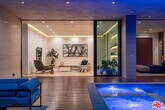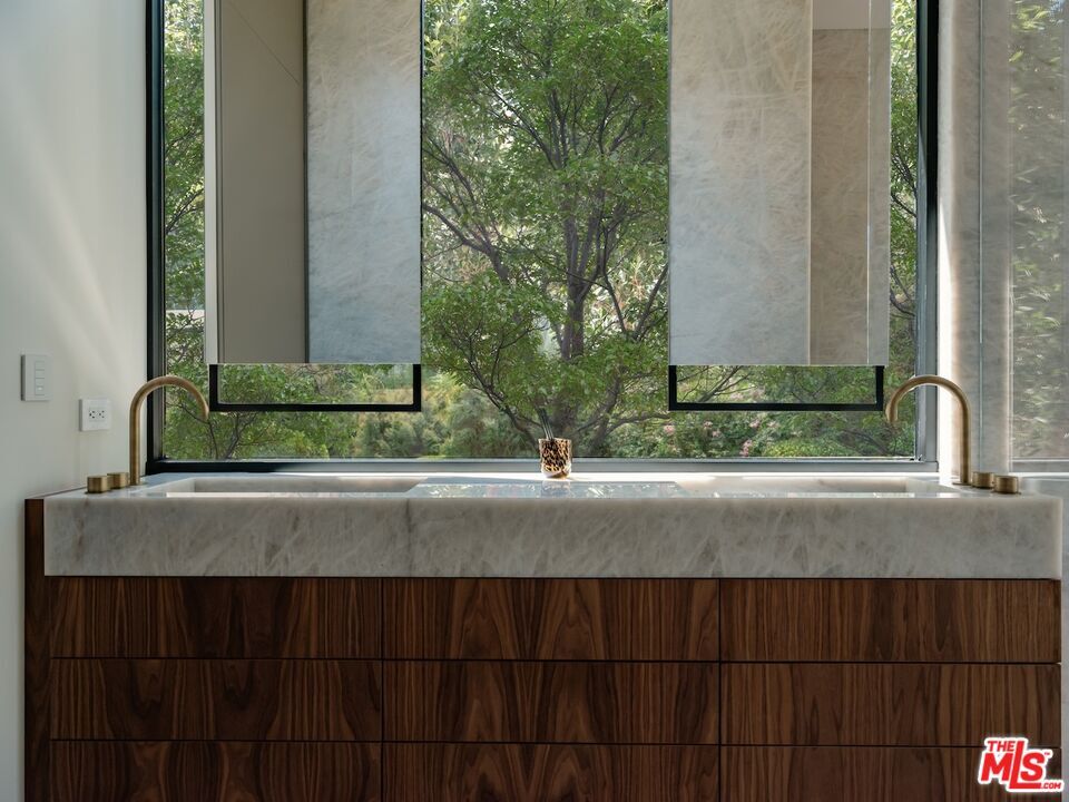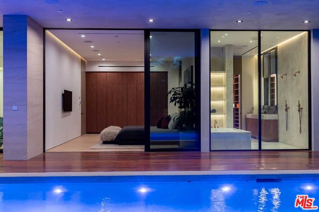 Nestled within the scenic hills of Studio City, 3748 Berry Drive is a testament to architectural brilliance and modern sustainability. This 6,264 sq.ft. net-zero masterpiece, crafted by Maison by PGB, seamlessly merges cutting-edge design with mid-century-inspired sophistication. Boasting 4 bedrooms, 4.5 bathrooms, a dedicated entertainment floor, private gym, and saltwater pool, the home offers not just breathtaking city views but a lifestyle defined by privacy and refined elegance. From the moment you step through the 10-foot glass pivot door, the home unfolds into an expansive, light-drenched sanctuary. Walls of multi-panel sliding glass doors erase the divide between indoor and outdoor living, while Moca Cream Portuguese limestone feature walls and brushed oak wide-plank flooring introduce warmth and timeless appeal. The chef's kitchen is a culinary marvel, featuring Taj Mahal Brazilian quartzite countertops, custom smoked walnut cabinetry accented with brushed brass, and state-of-the-art integrated Miele appliances. A stunning double-sided DaVinci fireplace delineates the living and dining spaces, inviting you onto a wraparound deck that frames unobstructed treetops and city views the perfect backdrop for entertaining or quiet reflection. The lower entertainment floor elevates hosting to an art form, complete with a custom bar adorned in Calacatta Gold Italian marble, polished concrete floors, and a dramatic smoked bronze mirror accent wall. Every bathroom feels like a private spa, with luxurious materials such as Cristallo Brazilian quartzite, Nordic Grey marble, and elegantly crafted brushed brass fixtures enhancing each space. True to its commitment to sustainability, the home features a photovoltaic solar array, grey water recycling system, and thermal-coated skylights for optimal energy efficiency. The outdoor spaces are equally captivating, with sprawling Ipe wood decks, a built-in BBQ island, and a shimmering 16' x 32' saltwater pool and spa, all embraced by lush, drought-tolerant native landscaping. MLS# 25605667