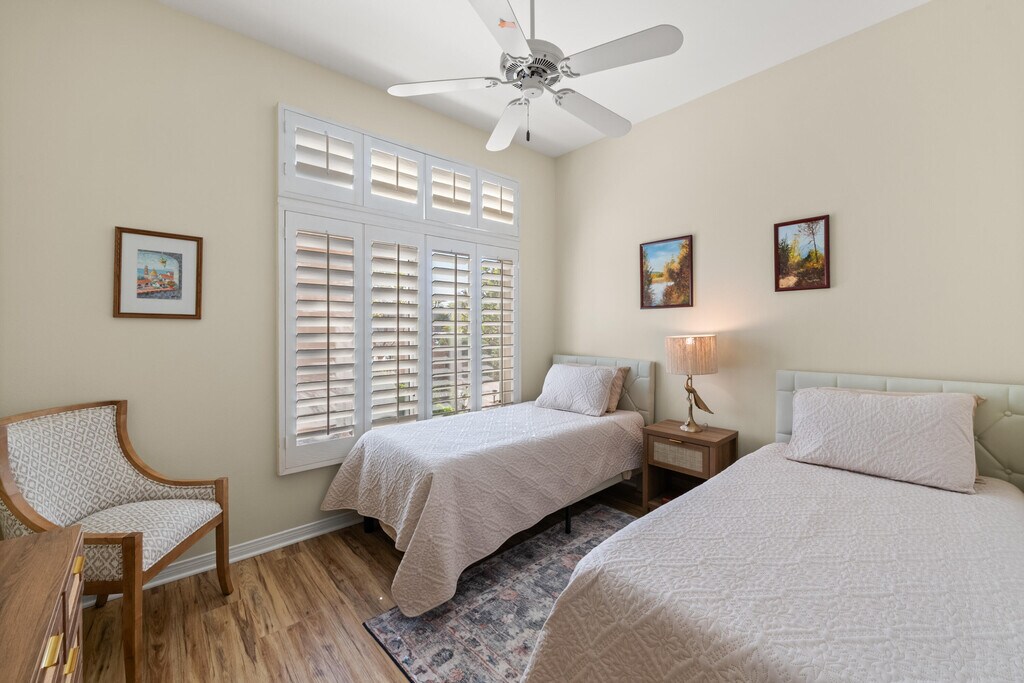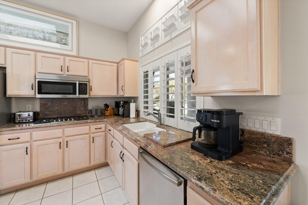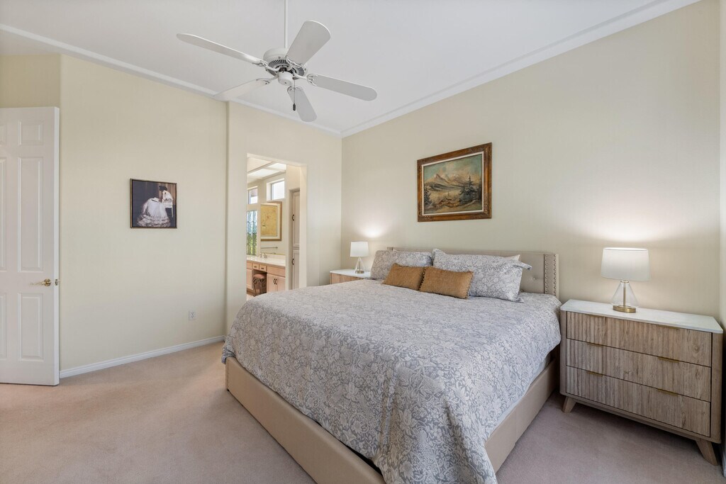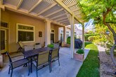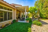 Sun City Palm Desert 55+ Emerald Model 3/3 + Den Turnkey Furnished. Lovely Dual On-Suite Estate floor plan home with gated courtyard and beautiful extended and fully furnished patio & BBQ faces west and is surrounded with trees and artificial turf has never been rented before. Double door entry 12' & 14' coffered ceilings,Large island chefs kitchen Granite & Stainless,double ovens,gas cooktop,large pantry all open to the family room with lg TV. Office with desk & printer and guest bath. Large Primary suite with king bed and bath with dual sinks & vanity,soaking tub,step-in shower and large walk-in closet. 2nd on-suit has private bath and queen bed. 3rd bedroom has twin beds and TV. 2+n golf cart garage includes golf cart. Owners prefer a 6 month rental. no pets. no smokers.