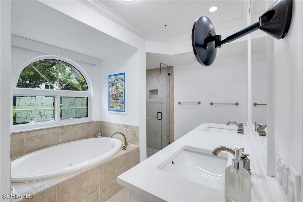 Discover the best of Olde Naples living in this beautifully decorated 2-bedroom,2-bath condo,ideally located just one block from the bustling 5th Ave S. Enjoy easy access to an incredible array of top-rated restaurants,boutique shopping,vibrant nightlife,and charming art galleries — all within walking distance. The pristine white sand beach is only three blocks away,perfect for sunbathing,swimming,or evening strolls along the shore. Step inside to a bright and open living area featuring elegant tile floors,crown molding,and plantation shutters. French doors open to a spacious screened lanai overlooking lush tropical landscaping,with direct access to the pool and BBQ area — ideal for relaxing or entertaining guests. The kitchen is fully equipped with granite countertops,a built-in bar,and plenty of dining space. The serene main bedroom boasts sliding doors opening directly to the pool area,a walk-in closet,and an en-suite bathroom with dual vanities and a walk-in shower. The guest bedroom and bathroom provide complete privacy,perfect for friends or family. This rare find also includes a one-car garage within the intimate Driftwood of Olde Naples complex,featuring only 8 residences surrounded by lush landscaping. Experience comfort,convenience,and style in the heart of Naples!