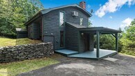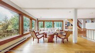 Located on one of Woodstock's most desirable roads sits this classic contemporary set on 5 acres. Privately situated on a town-maintained,dead end lane for that ultimate get-away feeling,this light-filled,two bedroom,two bathroom home with additional flex space,features soaring ceilings with solid wood floors,flooded with natural light from floor-to-ceiling windows. The main living area consists of an open floor plan featuring a kitchen and dining room with wood burning fireplace,living room and full bathroom. A central staircase leads up to the primary bedroom with ensuite bathroom and spectacular mountain views with door leading out to an expansive deck. Have your morning tea or coffee,take an al fresco shower to get your day started,or simply relax and gaze at the mountains. Also from the main living area,take another staircase to the lower level where you will find a capacious additional room featuring a vaulted ceiling and skylights with excellent potential to create additional living or creative space,or a home office.