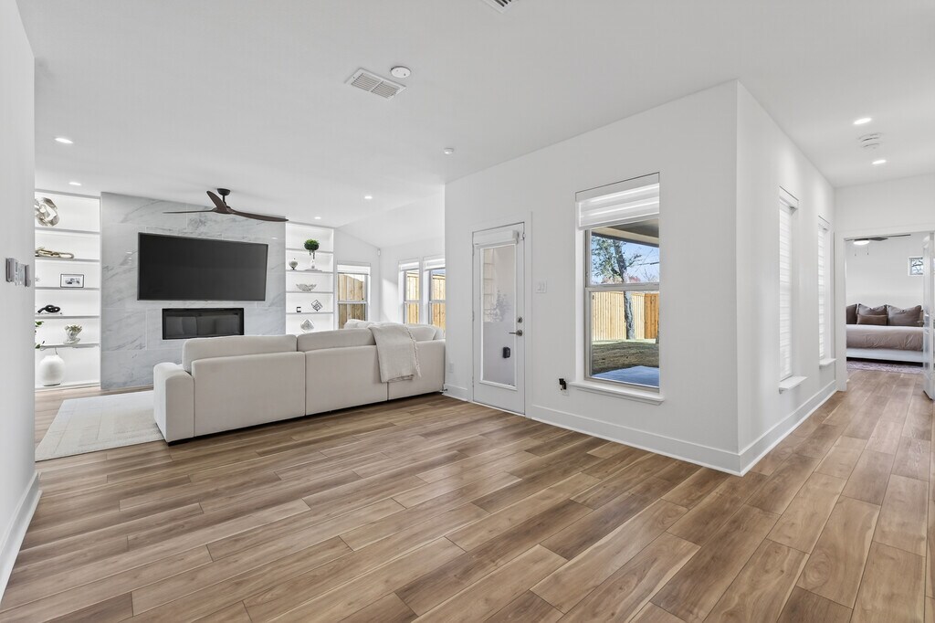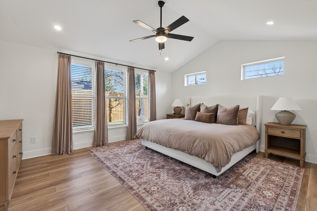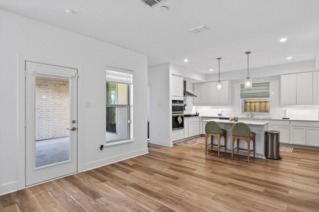 Move-in ready, brand-new 2025 home offering space, style, and modern comfort. This 2,900 sq ft contemporary residence features 4 bedrooms, 3 bathrooms, and an open, light-filled layout designed for comfortable living. The modern kitchen includes white cabinetry, a white tile backsplash, stainless steel appliances, gas cooking, and ample storage. A large living area with custom lighting and a feature wall creates a welcoming space for everyday living and entertaining. The first-floor primary suite offers privacy and convenience, while the second floor includes additional spacious bedrooms and flexible living space ideal for a home office, playroom, or media area. The home also features energy-efficient windows, modern finishes throughout, and a private fenced backyard. Included: washer, dryer, refrigerator, stove, microwave, and dishwasher. Pets: dogs and cats allowed with approval (breed and weight restrictions apply). Utilities: tenant responsible for all utilities. Located minutes from Bishop Arts District, Downtown Dallas, and the Southern Gateway Park, this home offers a balance of urban access and quiet residential living. Long-term tenants preferred. Renewal options available for qualified renters. Video 3D tour available — see full walkthrough here: