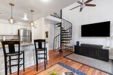 Experience the ultimate urban lifestyle in this stunning, fully furnished loft-style condo right in the vibrant heart of historic downtown Charleston. Located at the iconic corner of King and Calhoun Streets, this home places you steps away from the city's finest dining, high-end boutique shopping, and the serene beauty of Marion Square. Inside, you will find a perfect blend of historic character and modern luxury, featuring gorgeous heart of pine floors, soaring vaulted ceilings, and authentic exposed brick walls that give the space an undeniable executive feel. The open-concept kitchen is a chef’s dream, complete with sleek granite countertops, stainless steel appliances, and a convenient breakfast bar that flows naturally into the light-filled living area. Massive arched windows flood the space with natural light, creating a bright and airy atmosphere throughout the day. A stylish iron spiral staircase leads you to the second level, where the primary bedroom offers a charming overlook of the living space below. This floor also includes a second bedroom, perfect for a guest room or a home office, and a fully updated bathroom featuring a custom-tiled walk-in shower. For added convenience, the unit comes equipped with an in-unit washer and dryer. Living here means enjoying a walker’s paradise with a WalkScore of 99, all within a secure, controlled-access building. This is more than just an apartment; it is your front-row seat to the very best of Charleston living. Minimum 30-day lease for this property.