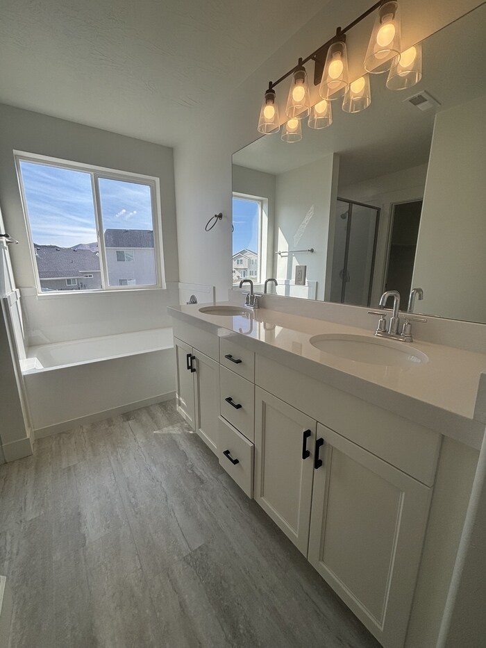 Rent: $2,400.00 Security Deposit: $2,400.00 (fully refundable upon a move out inspection) Lease Initiation Fee: $100.00 Application Fee: $40.00 per adult Utilities: tenant's responsibility by meter read Pet Friendly - fee vary between breeds. Contact Agent for details. This beautiful 4-bedroom, 2.5-bathroom home offers a perfect blend of style and comfort with quartz slab countertops, freshly painted cabinets, and laminate flooring throughout the main level. The spacious master suite features vaulted ceilings, a dual-sink vanity, and a separate tub and shower, creating a spa-like retreat. You'll love the bright, windowed laundry room and the convenience of included front yard landscaping, making exterior maintenance a breeze. With its thoughtful design and modern finishes, this home is move-in ready and sure to impress. Contact Amanda Dutton wit Equity Property Management for a showing or for additional questions at / . Equity Real Estate is committed to equal housing opportunity. We do not discriminate against anyone. You can apply at This property allows self guided viewing without an appointment. Contact for details.