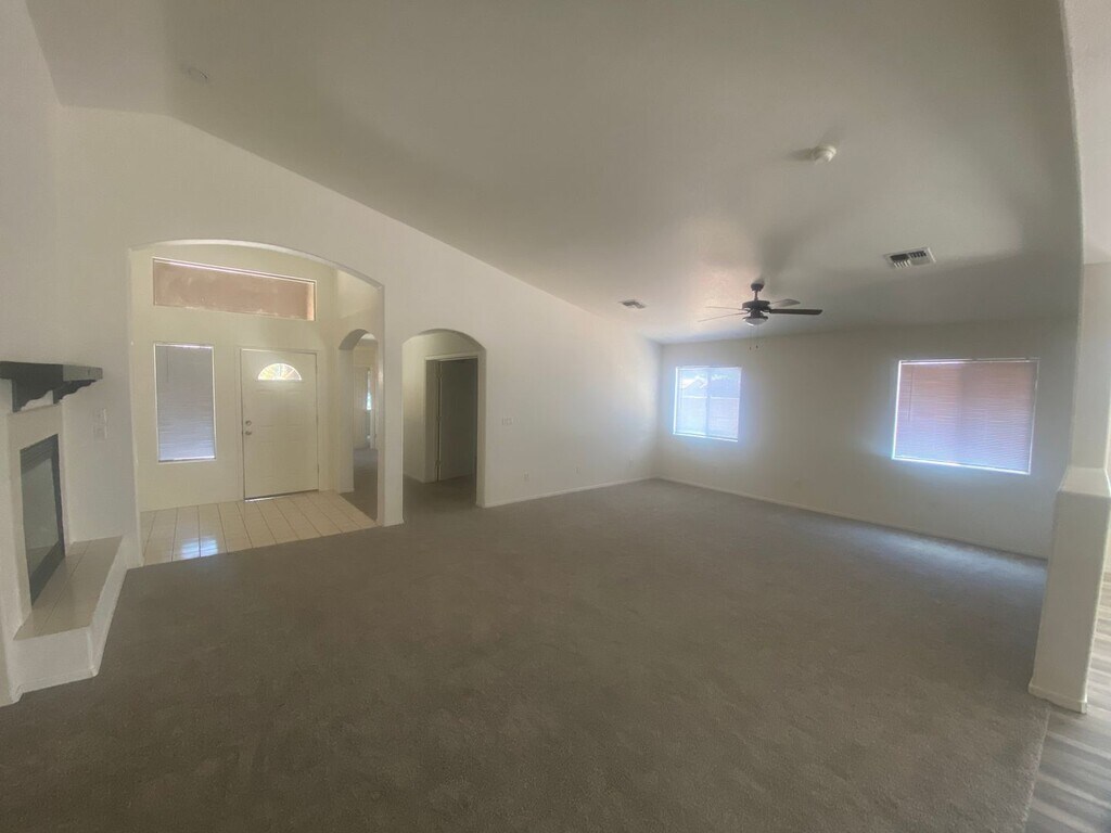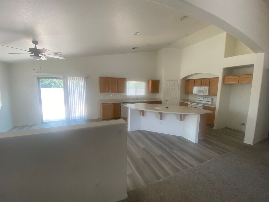 Welcome to the corner lot in the Villas, a delightful 3-bedroom, 2-bathroom home located in the vibrant city of Kingman, AZ. This home boasts an open split floor plan, offering a spacious and flexible living space. The kitchen is a chef's dream, complete with an electric stove, microwave, large pantry, and a convenient island. The living room is a cozy retreat, featuring a gas fireplace and carpeting that extends into all bedrooms for added comfort. The master bedroom is a true sanctuary, complete with a walk-in closet and an en-suite bathroom that features a garden tub and an all-glass shower. Each room is equipped with a ceiling fan, ensuring a comfortable environment year-round. The home also includes a 2-car garage and central heating and air conditioning. Experience the perfect blend of comfort and convenience in the Villas. 1.5 % admin fee per month. Security Deposit: $1895.00 Non-refundable cleaning/redecorating $350 Lease Admin Fee: 1.5%
