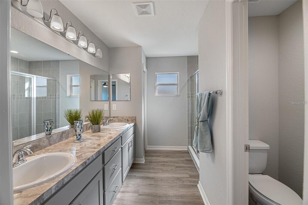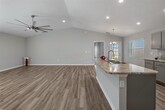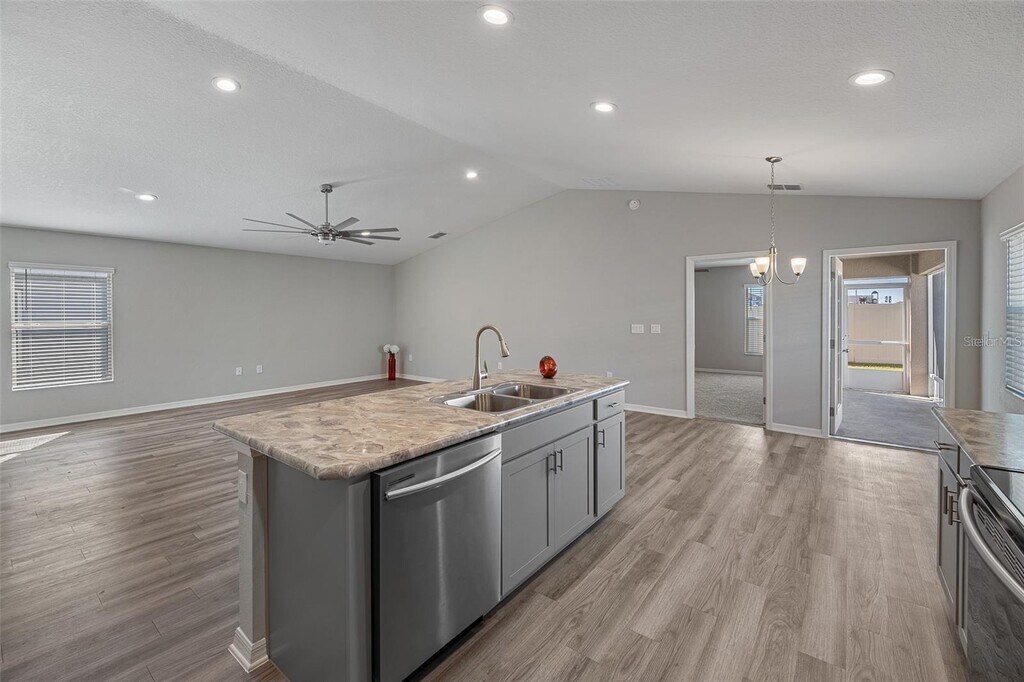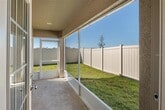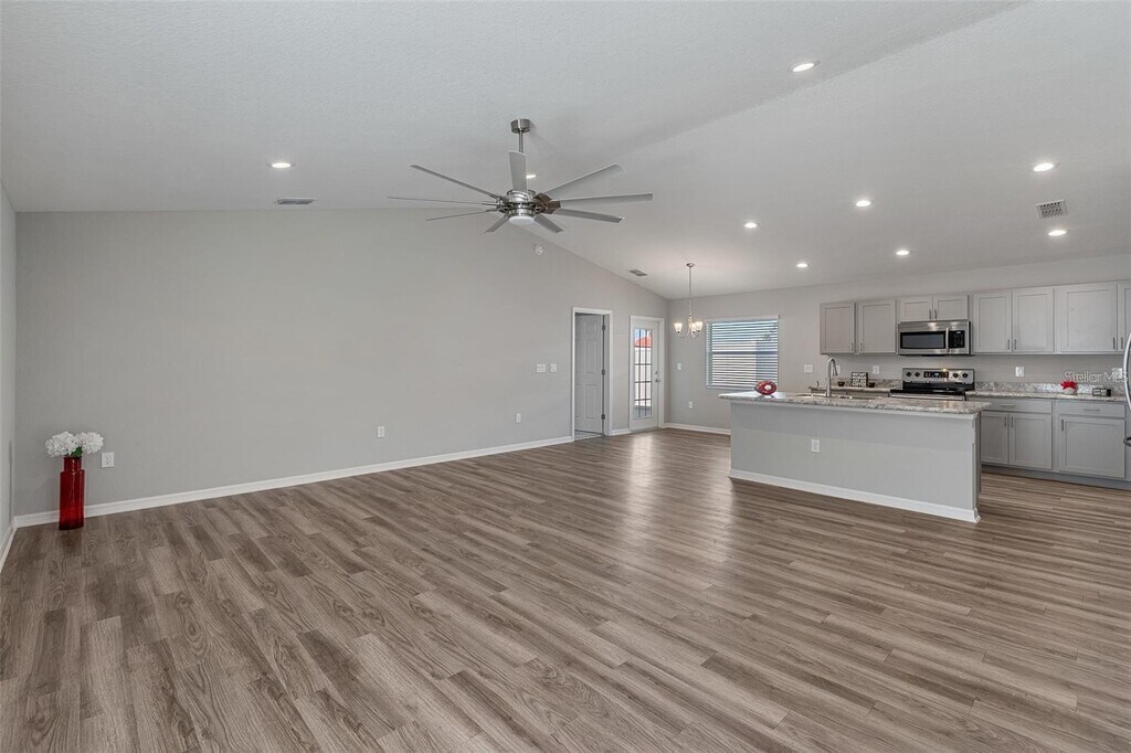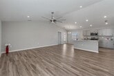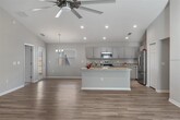 Welcome to The Begonia, an award-winning Highland Homes floor plan offering comfort, style, and energy efficiency. This beautifully designed home features an open-concept layout with soaring volume ceilings, a spacious great room, an elegant dining area, and a modern kitchen with Aristokraft cabinetry, Samsung stainless steel appliances, a counter-height breakfast bar, LED recessed lighting, and wood-look vinyl plank flooring in main areas. The luxurious owner's suite includes a large walk-in closet and a private en-suite bath with dual vanities and a tiled shower. Enjoy outdoor living on the charming front porch or the covered lanai. Additional highlights include stain-resistant Mohawk carpeting in the bedrooms, built-in pest control, Florida-friendly landscaping with irrigation, a walk-in pantry, and energy-saving features such as R-30 attic insulation, foam-injected block walls, Low-E double-pane windows, and a programmable thermostat. This home is the perfect blend of modern design and practical living. Schedule your showing today!