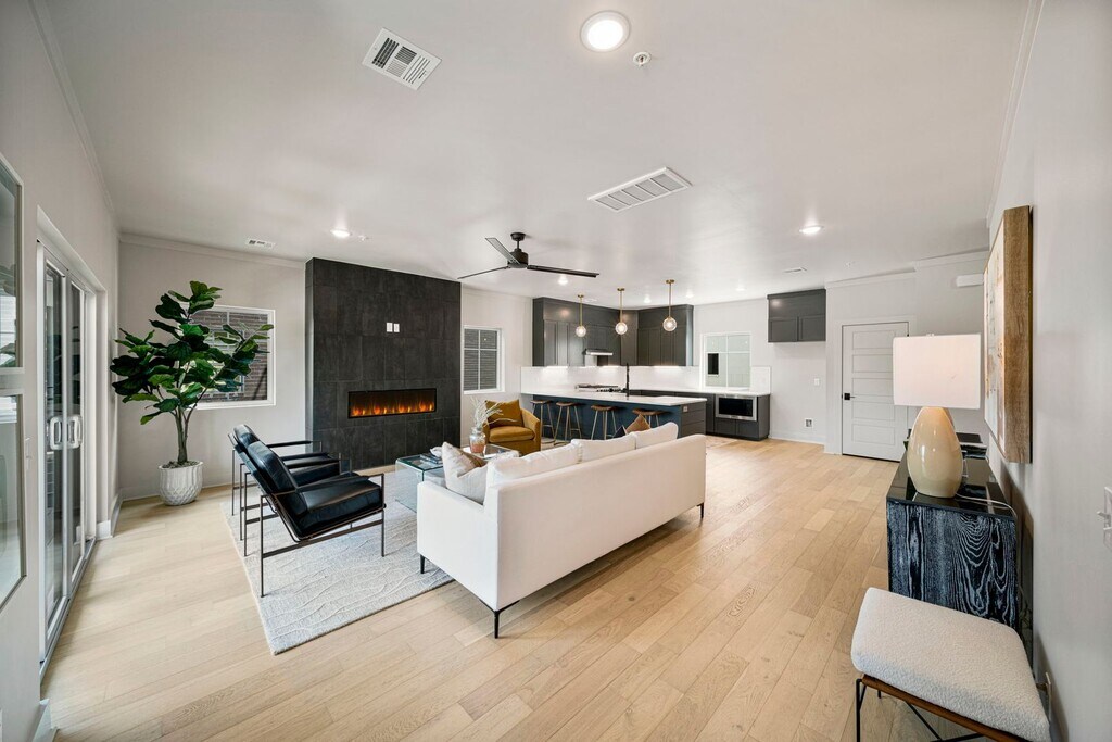 Discover modern elegance in the newly constructed Edgewater Condominiums, a boutique community featuring 18 luxurious units with 9 still available for purchase. The main level offers an open-concept design with a spacious living area, a stunning fireplace, and a chef's kitchen featuring quartz countertops, professional stainless steel appliances, a prep sink, and island seating. A versatile office or dining nook and a stylish powder bath complete the space. Upstairs, you'll find two private master suites with luxe bathrooms, large walk-in closets, and a conveniently located laundry room. The ground level includes a spacious two-car garage with ample storage. These condos boast tall ceilings, abundant natural light, and exceptional storage throughout. Located directly across from Riverside, Edgewater Condominiums are within walking distance to Brookside, The Gathering Place, and scenic trails, offering a lifestyle perfect for work, recreation, and entertainment. Whether you're seeking a full-time residence or a lock-and-leave option for travel, these condos are designed to meet your needs. Don't miss this rare opportunity!