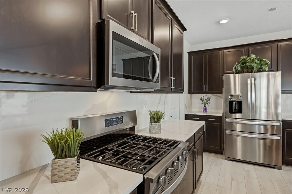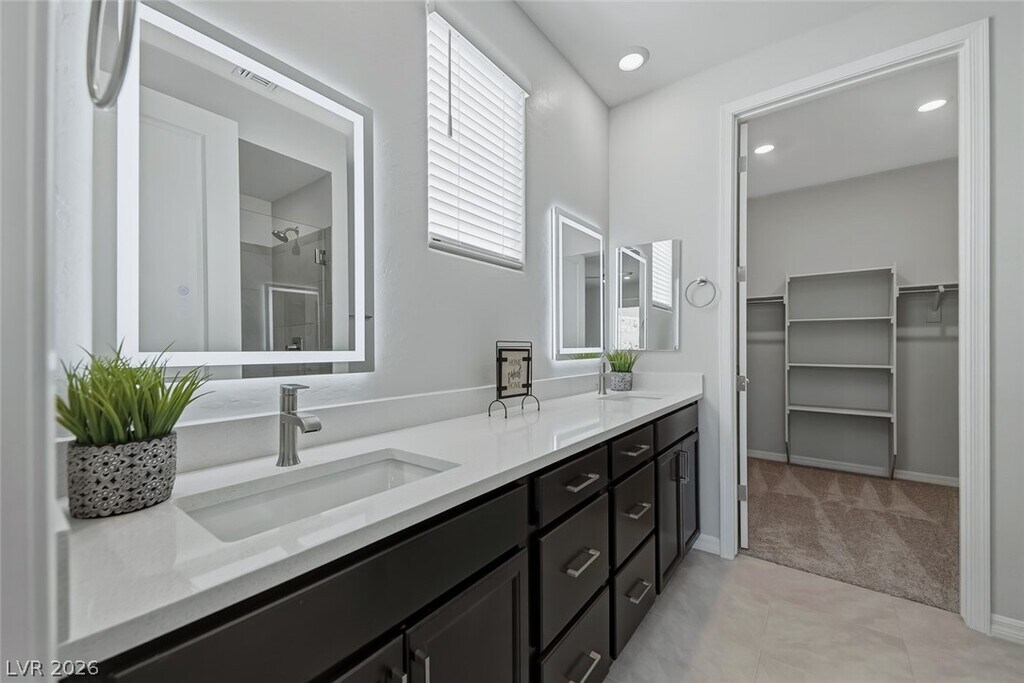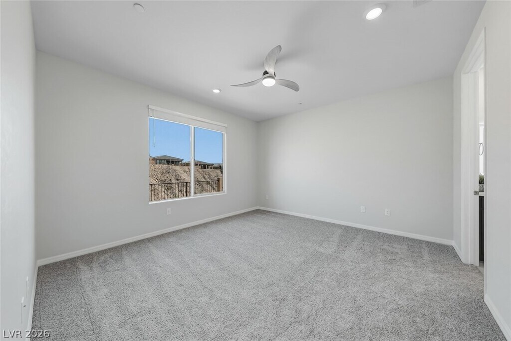 Welcome to this beautifully appointed home in the highly sought-after 55+ gated community of Del Webb Lake Las Vegas. This newly built 3 bed, 2 bath residence features an open-concept great room w/ recessed lighting & an oversized fan, creating a bright & comfortable living space. The kitchen showcases a large quartz island, stainless steel appliances, custom cabinetry & a spacious walk-in pantry. The dedicated laundry room includes a sink & built-in storage. The primary suite is thoughtfully separated from the secondary bedrooms & offers dual sinks, LED mirrors, a walk-in shower & custom closet system. Two additional bedrooms are generously sized & located near the entry. Step outside to a low-maintenance backyard w/ pavers, gravel & artificial turf overlooking desert landscaping w/ a partial lake view. The covered patio includes a ceiling fan. Epoxy-finished garage, tankless water heater & water softener included. Landscaping & trash service provided. Schedule your showing now!