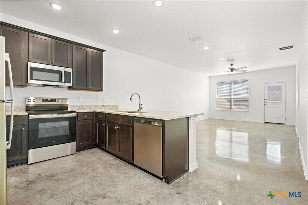Welcome home to this stunning newly built 3 bedroom,2 bathroom duplex,designed with modern living in mind. Located in an upscale,quiet neighborhood,this home offers the perfect blend of style,comfort,and convenience—ready for immediate move-in. Step inside to be greeted by beautiful stained concrete flooring that flows seamlessly throughout the home,creating a sleek and durable finish. Large windows fill the space with natural light,highlighting the contemporary design and open-concept layout. The chef-inspired kitchen features: stainless steel appliances,granite countertops,modern cabinetry,bar seating / open dining layout. Each bedroom offers generous space,and both bathrooms are beautifully designed with high-end finishes. With granite carried throughout the home,the aesthetic is cohesive,fresh,and luxurious. Enjoy low-maintenance living in a duplex that feels like a high-end single-family home. This one checks all the boxes — new,modern,bright,and nestled in a desirable community.
