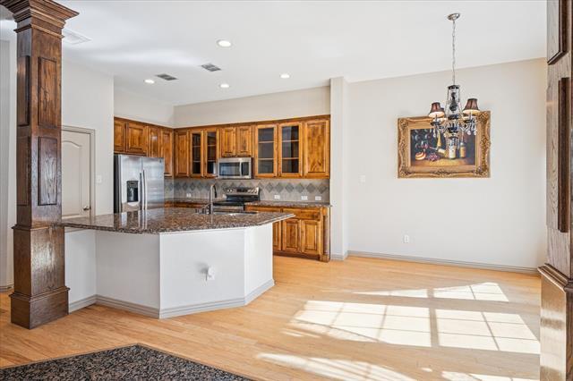 Welcome to this stunning 2-story, 4-bedroom, 3-bath townhome nestled in the sought-after Villas of Versailles community! This beautiful and spacious home is loaded with upgrades, from elegant crown molding and rich hardwood flooring in the entryway to luxurious marble tile throughout the living room. The gourmet kitchen is a chef’s dream, featuring a large granite island, sleek stainless steel appliances, and a refrigerator that’s available for tenant use. Enjoy your own private backyard oasis with a built-in deck—perfect for relaxing or entertaining guests. The attached 1-car garage offers secure parking, and the HOA handles front yard maintenance and trash removal, giving you a low-maintenance lifestyle. Partial furnishings can also remain for added convenience if desired! Don’t miss your chance to lease this beautifully maintained home in a prime Irving location—schedule your private tour today before it’s gone!