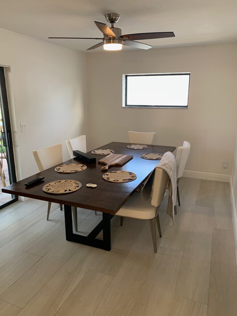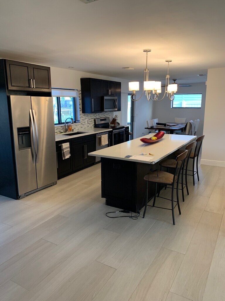 Beautifully updated 2 Bedroom, 2 Bath waterfront home with an open floor plan ideal for entertaining! Just bring your boat and enjoy the perfect blend of luxury, comfort and South Florida charm. Enjoy your morning coffee or unwind from work in this wonderful 70 ft wide backyard and large patio with ideal space for relaxation or entertaining friends and family while overlooking the waterway and sparkling HEATED swimming pool. Primary bedroom, living rm and kitchen all have sliders that offer bright natural sunshine and access to an amazing patio and unforgettable sunsets! Fabulous kitchen with wine/coffee bar, upgraded stainless appliances (fridge has water & ice thru the door, self cleaning oven), floating island with waterfall quartz counters. Both bedrooms are large enough for king beds and home offices. Primary has walk-in closet & double sinks. A separate space on other side of the house from bedrooms has room for day bed or office. Short walk or bike to Starbucks, beach, gyms, bars, restaurants and shopping. 5 minute boat ride to the intra-coastal and direct ocean access is a 15 minute scenic ride with only one fixed bridge approx 13 ft clearance. Boat dock, full size washer and dryer, 1 car garage with lots of storage space, circular driveway, hurricane impact windows/sliders. $5,000 per month. House is offered unfurnished, pictures are staging. Move in with First/Last/security deposit. Tenant pays electric and water. Pool and lawn service included in rent. Pets welcome upon approval. Available now. Realtors please bring your clients, standard 1/2 month commission will be paid.