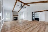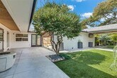Modern luxury meets effortless living in this beautifully updated 3 bedroom, 2.5 bath home located in highly sought-after Plano ISD. Thoughtfully designed with elevated finishes and flexible spaces, this home offers both style and functionality. Step through the oversized entry door into a light-filled living area featuring vaulted ceilings with exposed wood beams, custom millwork, light wood laminate flooring throughout, and a floor to ceiling stone fireplace with floating wood mantle. The open layout creates an inviting yet sophisticated atmosphere. The kitchen is equipped with white cabinetry, granite countertops, a gas cooktop, Samsung stainless steel appliances, KitchenAid microwave and dishwasher, a modern black farmhouse sink, walk-in pantry, and charming shiplap detail in the breakfast area. The spacious primary suite offers dual sinks and a spa inspired rain shower. Two additional bedrooms provide comfortable accommodations with access to well appointed bathrooms. A versatile flex space with a full wall of built in bookshelves and lower storage is ideal for a library, playroom, office, or media room. A sleek black steel and frosted glass sliding door adds architectural character. Enjoy exceptional outdoor living with a private courtyard style yard featuring low maintenance turf, mature trees, modern black fencing, string lighting, and multiple entertaining areas. The covered patio includes a wood-paneled ceiling and mounted TV, with an additional fire feature area perfect for gatherings.
