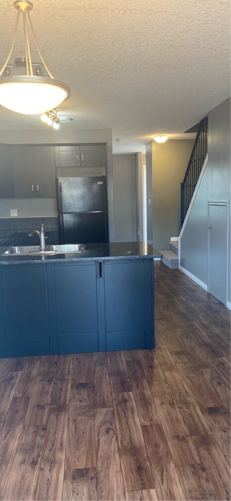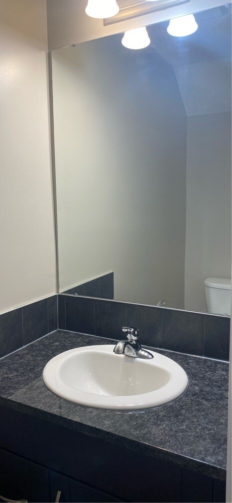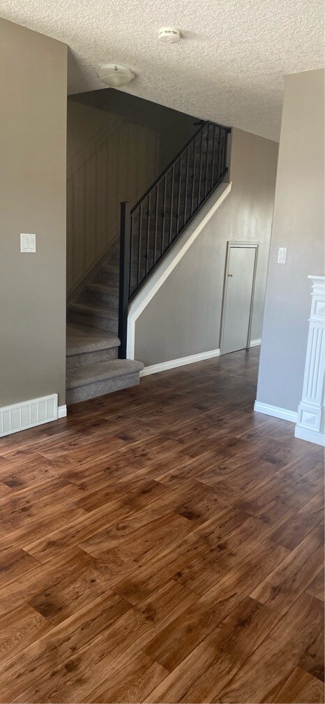 Well-maintained professional condo with upgraded laminate flooring throughout main floor. The inviting living room, featuring an electric fireplace, flows into a bright kitchen with dark maple cabinets, granite countertops, black appliances, and an eat-up bar. Natural light fills the main level and upstairs. The dining area is spacious and includes a convenient two-piece guest bathroom. Upstairs, three generously sized bedrooms await, including a master with a walk-in closet. A four-piece main bathroom and laundry area are also on the second floor. Enjoy central air conditioning and one parking spot. No Pets and No Smoking, Water included in Rent