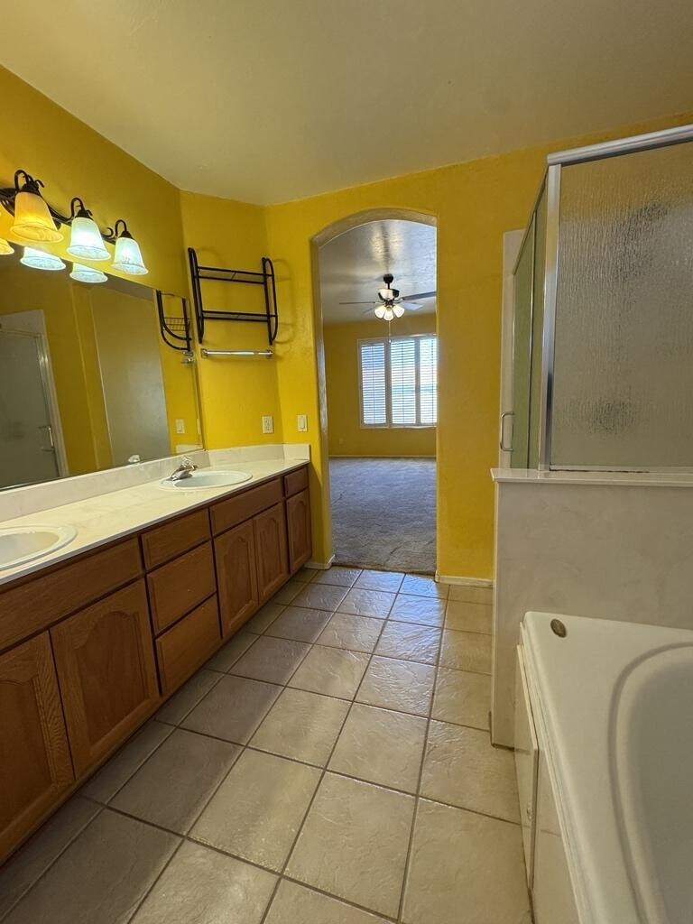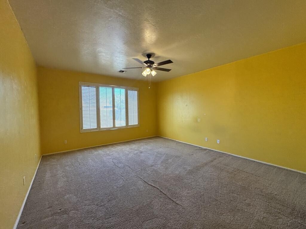 Beautiful 4 bedroom home in the neighborhood of Canyon De Flores! Open floor plan with a great room that features a breakfast bar in the kitchen,gas log fireplace in the living room. Plantation shutters in every room. Spacious master with walk-in closet,dual sinks,separate shower garden tub with jets! Oversized backyard with grass gravel landscaping a storage shed. Extended covered patio looks out to the beautiful Mountain Views! No cats. Pets approved on a case by case basis.