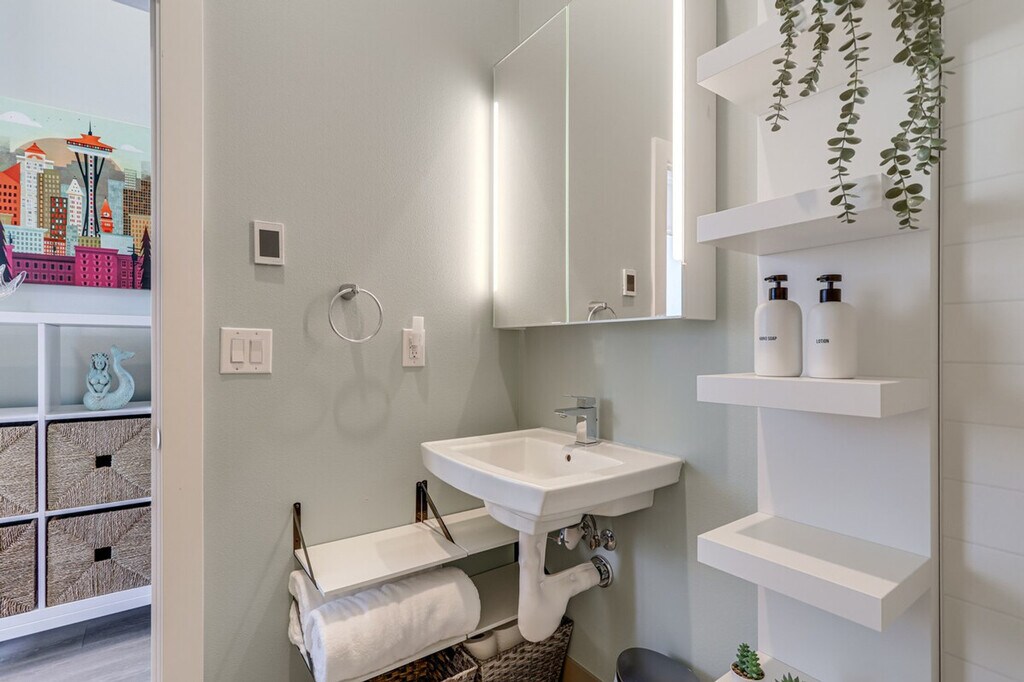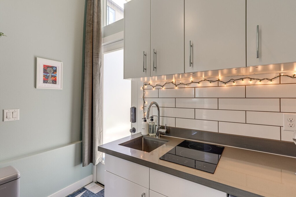 Feel at home in 'The Zen Den,' a chic, ground-floor studio townhouse in Seattle's popular Magnolia neighborhood with step-free entry. This apartment features a smart TV, board games, books, and a sitting area. The kitchenette includes a refrigerator, 2-burner induction cooktop, drip coffee maker with starter coffee, air fryer/grill, microwave, spices, cooking basics, dishware, flatware, a washer and dryer with laundry detergent, linens and towels, trash bags and paper towels, complimentary toiletries, a hair dryer, and hangers. Parking is available in a shared parking area for one vehicle on a first-come, first-served basis, and free street parking is also available. Pets are welcome with a fee of $100. Enjoy walkable access to Discovery Park and other essentials. Explore Pike Place Market, stroll along the Puget Sound, or sample local eats with your four-legged friend in tow. The homeowner lives on-site in a separate upstairs unit with a separate entrance and may be present during your stay. This property features 2 exterior security cameras that are outward facing and record video and audio when motion is detected. Camera 1 is located on the front doorbell facing the front entrance, and Camera 2 is located above the back door facing the back entrance. Events, parties, or large gatherings are not allowed. Guests must be at least 18 years old to book. Includes a dedicated workspace and free Wi-Fi. - Guests will have access to the entire property via keyless entry [SI]
