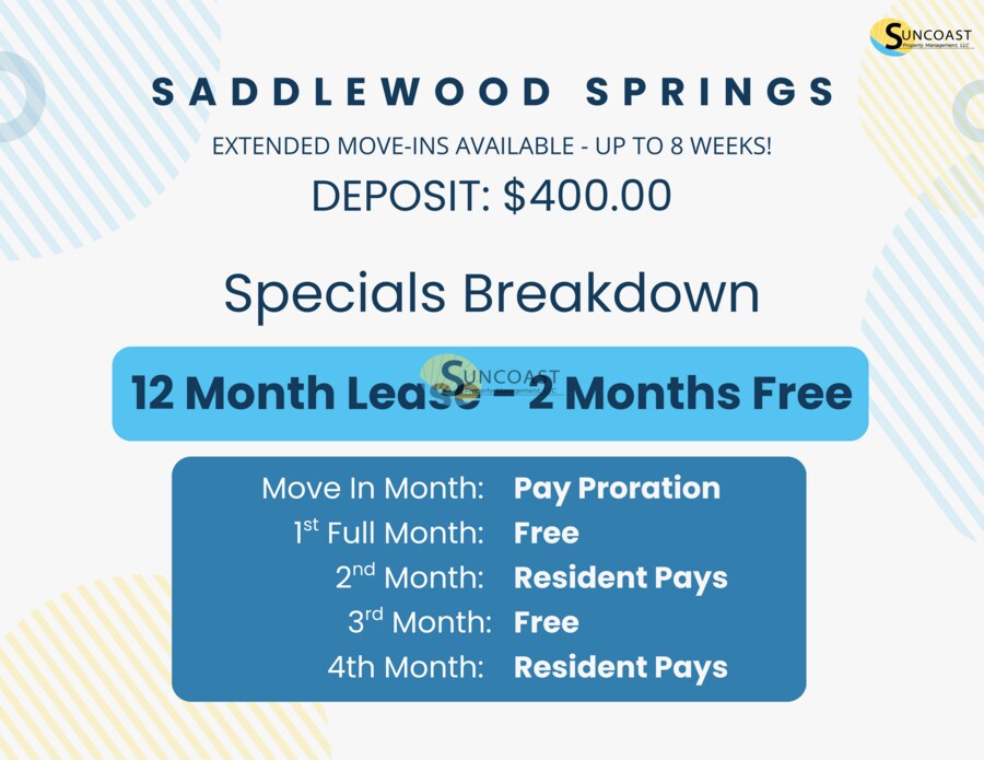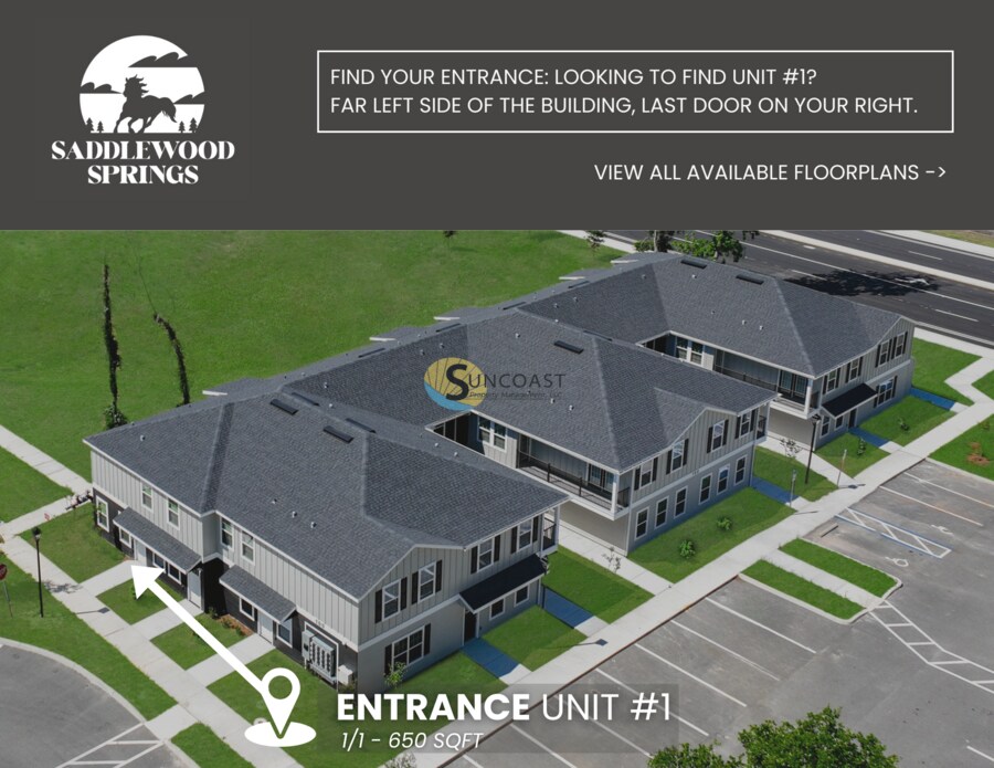 Limited-Time Saddlewood Special: $400 deposit + 2 months free on select homes! Pick the lease that fits your plans starting at just 7 months through 12 Months! New Construction Alert! Saddlewood Springs is ready to welcome its first residents! First Floor Unit! Each unit comes with a washer and dryer! This new community in Ocala, FL features 1-bedroom, 1-bathroom and 2-bedroom, 2.5-bathroom townhomes, offering the perfect blend of advanced design and convenience. Each townhome includes modern interiors such as satin nickel door hardware, knockdown textured ceilings, and stainless-steel kitchen appliances. Enjoy the added convenience of in-unit washers and dryers and keyless entry with Mojo Lock. Plus, with luxury vinyl plank flooring and granite countertops, your new home will be both beautiful and functional. Located across from Saddlewood Elementary and surrounded by restaurants, parks, and shops, Take advantage of this limited time offer and enjoy all the perks of new construction living. Specials available now apply today before they're gone! Suncoast Property Management does require tenants to carry renter's insurance with Suncoast Property Management listed as additionally insured. Proof of renter's insurance must be provided prior to the tenant's scheduled move-in. All SunCoast Property Management residents are enrolled in the Resident Benefits Package (RBP) for $75.00/month which includes liability insurance, credit building to help boost the residents credit score with timely rent payments, up to $1M Identity Theft Protection, HVAC air filter delivery (for applicable properties), move-in concierge service making utility connection and home service setup a breeze during your move-in, our best-in-class resident rewards program, on-demand pest control, and much more! The RBP is an additional cost and is not included in the advertised monthly rental rate. More details upon application. BE AWARE of potential fraud. If you suspect one of our properties being listed fraudulently, please email: Suncoast Property Management does NOT ask any of our potential residents to wire funds. Our main office is located in Jacksonville, Florida and you can visit our website to verify any rental listing. Photos are for illustration purposes only and some details may differ! An additional $25 trash fee will be due every month and is in addition to the advertised rental rate. Required Internet Disclosure - Quantum Fiber Only This property is exclusively wired for Quantum Fiber internet service. All units are pre-wired with fiber-optic infrastructure, allowing residents to connect to high-speed internet immediately upon move-in. No additional equipment or installation is required. Please note that Quantum Fiber is the only internet provider available at this location due to the dedicated fiber wiring. Other internet service providers are not supported. Pay Online Pets Allowed Washer/Dryer Connections Washer/Dryer In Unit Brand-New Apartment Homes in Ocala, FL! Discover modern living at Saddlewood Springs, a newly constructed apartment community designed with comfort, convenience, and style in mind. These homes offer a fresh, contemporary feel paired with everyday functionality. Modern Floor Plans & Interior Finishes • Spacious 1 & 2 bedroom apartment homes • Thoughtfully designed open-concept layouts • Granite countertops and stainless steel appliances • Stylish luxury vinyl plank flooring throughout • Modern cabinetry with clean finishes and updated hardware • Bright, functional kitchens with ample storage and prep space Smart & Convenient Home Features • In-unit washer & dryer included • Keyless entry with smart lock technology • Energy-efficient construction and appliances • Well-designed layouts that maximize natural light and usability Community & Lifestyle Perks • Pet-friendly community • Professionally managed for peace of mind • Attractive community layout with maintained common areas • Designed for low-maintenance, modern living Prime Ocala Location • Conveniently located near shopping, dining, and everyday essentials • Close to major roadways for easy commuting • Near parks, recreation, and local entertainment options • Positioned within a growing Ocala neighborhood Why Saddlewood Springs Whether you’re looking for a brand-new apartment, modern finishes, or a convenient Ocala location, Saddlewood Springs offers a well-rounded living experience with the features today’s renters are searching for.