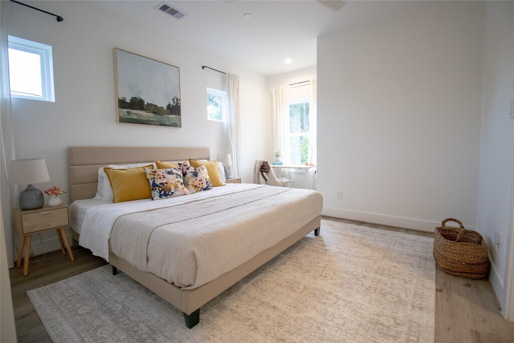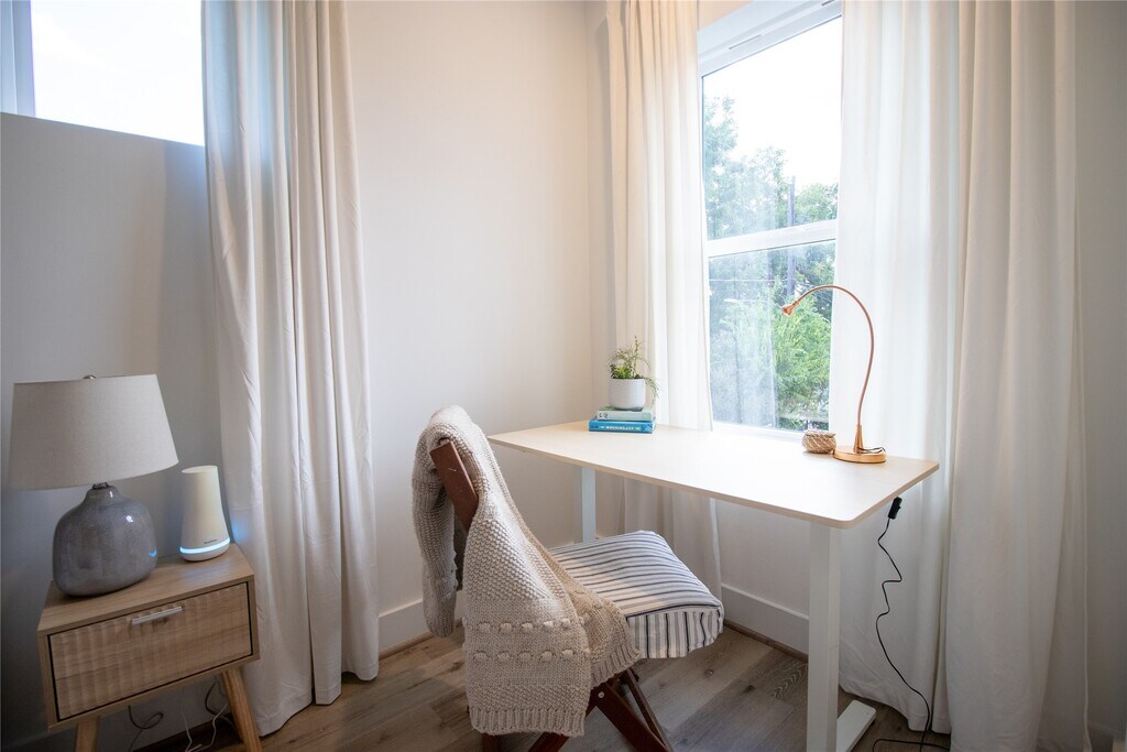Come home to a feeling. Picture pulling into your private parking spot directly in front of your front door after a long day,stepping into a space that instantly exhales calm. Ten-foot ceilings create an open,airy volume that fills with the golden light of sunset pouring through 9-foot-wide,6-foot-tall triple-pane windows. The kitchen’s quartz counters,matte black fixtures make even a simple dinner feel intentional. Unwind with a glass of wine on your private rooftop patio,where the downtown skyline glows at dusk and fireworks light up the Fourth of July sky. Or relax in your fenced backyard,surrounded by the quiet hum of Northside Village’s tree-lined streets. Every detail—from the spa-style bath and in-unit washer/dryer to the efficient floor plan and modern lighting—was designed to feel elevated yet effortless. Located just steps from the Moody Park Light Rail Station,Kennon Heights offers the freedom of urban connectivity with the comfort of home. MLS# 46420111