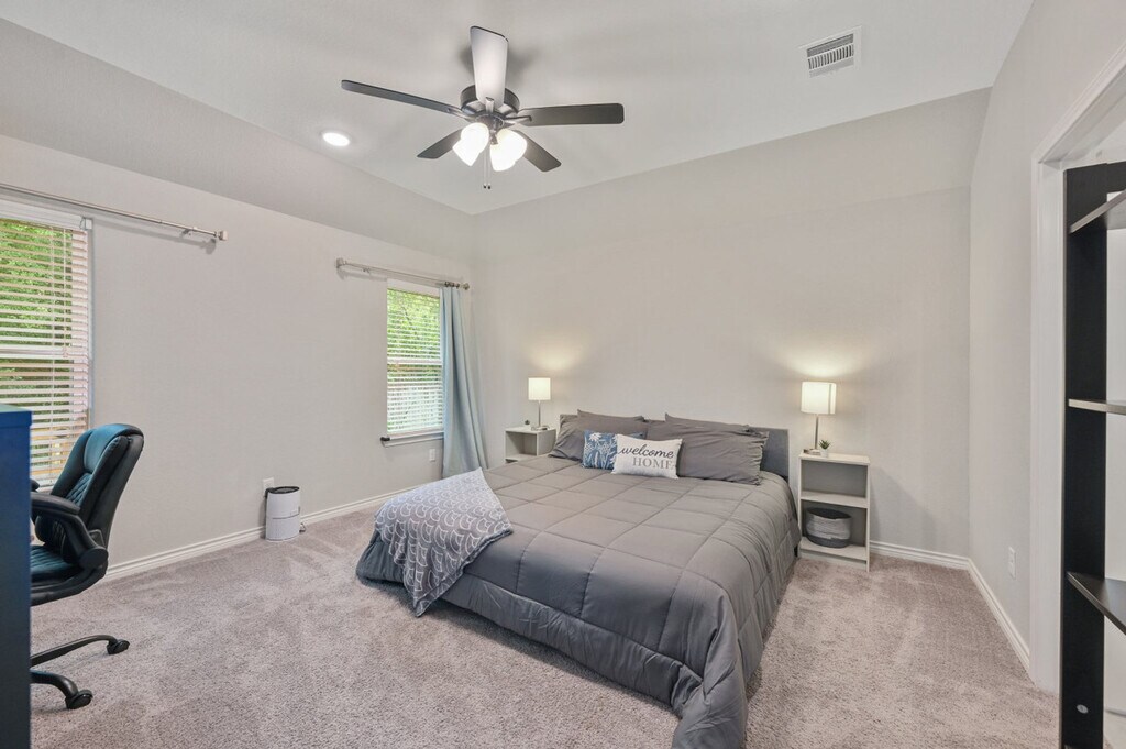 Welcome to Creekside Cottage! Feel at home in this modern Texas retreat, less than 15 minutes from Texas A&M University. Perfect for families, game-day weekends, campus visits, or a relaxing getaway, this stylish home blends contemporary design with warm Texas touches, set against a serene creek and wooded backdrop. This spacious and family-friendly home features three bedrooms and two bathrooms, plus a trundle bed. The sleek, updated interior features open living spaces and tasteful decor reflecting subtle Texas style. The fully equipped kitchen includes modern appliances and a granite island, with a dining area for shared meals. Relax in the open living room with a large sectional and abundant natural light. Large windows frame peaceful creek and wooded views, and outdoor spaces are ideal for morning coffee or quiet evenings. Nearby highlights include Texas A&M University (less than 15 minutes away), Urban Table, TaD’s Louisiana Cooking, Blue Baker, downtown College Station, and other nearby attractions. Guests must be 25 years or older to reserve the property and digitally sign the booking agreement prior to check-in. Smoking is not allowed in or on the property, and if evidence of smoking is detected, $400 will be retained to deodorize the home. Do not turn the thermostat below 69 during the summer as the unit could freeze, and the guest will be charged the cost to repair the heating/cooling system. When leaving in the summer season, turn the thermostat up to 80 degrees. When leaving in the winter season, turn the thermostat down to 60 degrees. If unauthorized guests stay overnight, a fee of $300 will be retained, plus $25 per person. Parties are prohibited. Pets are not allowed at Creekside Cottage, and if a pet is found on the property without prior approval, a pet fee will be charged and the booking may be terminated. If the cleaning crew finds that the property has been left excessively dirty, you will be billed for the additional cleaning time at a rate of $50 per hour. No trash or other items may be left on the property or outside the front door. All trash must be bagged when placed in a dumpster, or there will be a $20 charge. Guests may not alter, tamper with, or access security cameras in any way, and failure to follow this rule will result in charges for the full amount of the damages caused. There are two security cameras located at the property, in the front driveway and on the back porch. Registration Number: STR2024-000139 [SI]
