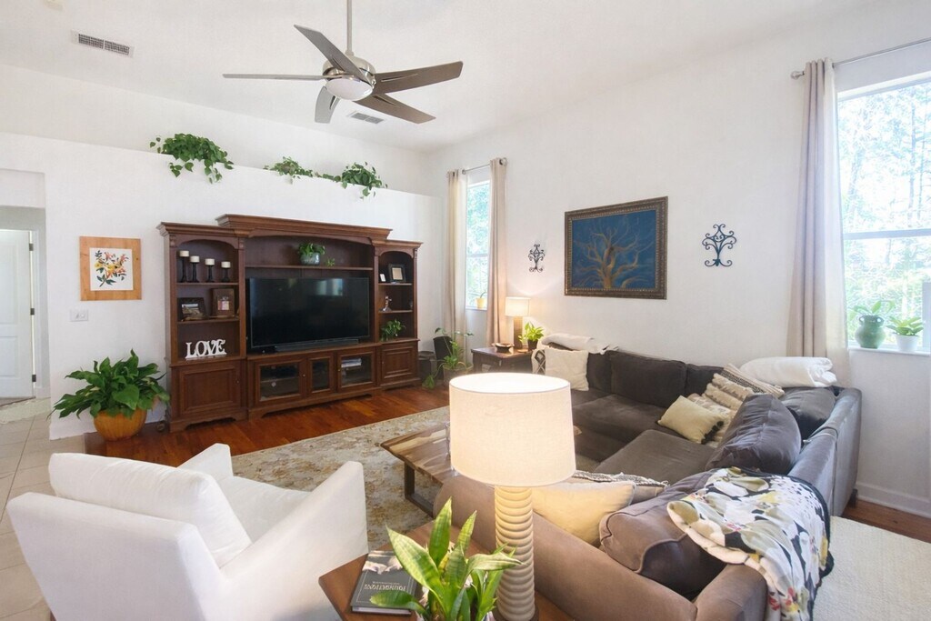Beautiful Executive Home in Conservation Area – 5 Bedrooms | 4 Full Baths Located in a serene conservation setting just minutes from recreation, this stunning executive home offers space, luxury, and comfort throughout. This spacious home features 5 bedrooms and 4 full bathrooms, along with a 3-car garage and a large covered, screened patio with elegant paver flooring perfect for outdoor entertaining. The property showcases tropical landscaping, custom tile work, and beautiful wood flooring throughout the main living areas. The gourmet kitchen is a chef’s dream, featuring 42-inch cabinets, a bar area overlooking the family room, and soaring 12-foot ceilings on the first floor, creating an open and inviting atmosphere. Upstairs, you’ll find a generous bonus room with a private bedroom and full bathroom, ideal for guests or multigenerational living. A dedicated living/office area provides additional flexibility. The large master suite serves as a luxurious retreat with a huge master bath, complete with his and hers vanities, a separate soaking tub, and a walk-in shower. Rent includes lawn service, and residents enjoy access to outstanding community amenities including a resort style pool and playground. This home truly has it all! All of our residents are enrolled in the Resident Benefits Package (RBP) for $39.95/month, which includes renters insurance, HVAC air filter delivery, credit building to help boost your credit score with timely rent payments, $1M Identity Protection, and much more! More details upon application.