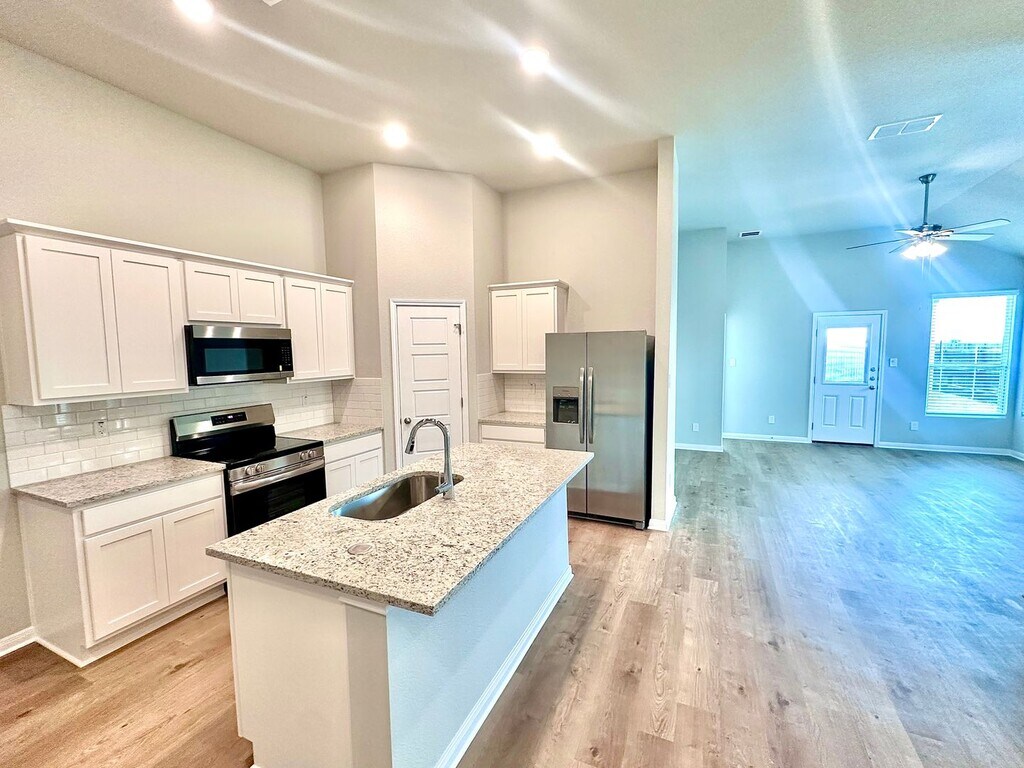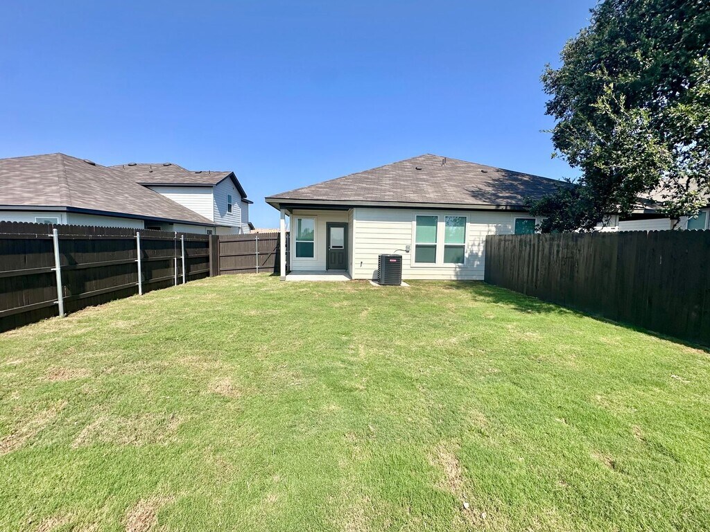 This beautifully designed 3-bedroom, 2-bathroom duplex features just over 1300 sq. ft. of well-planned living space, including a spacious open-concept layout, hardwood laminate flooring, and soaring 11-foot ceilings. Large windows throughout provide excellent natural light in every room. Stunning chefs kitchen includes; stainless steel appliances, granite counter tops, large kitchen island, stylish tile backslash, and sleek white cabinetry. Large master suite, located on opposite end of the home from the secondary bedrooms. The master ensuite bathroom features granite counter-tops, double vanity, generous cabinet storage, and a luxurious walk-in shower. The expansive walk-in closet is sure to impress, offering ample space for all your wardrobe needs. Just off the garage, you’ll find a practical and stylish drop zone—perfect for organizing your daily essentials. Every inch of this home is designed with functionality in mind, with smart storage solutions throughout. Step outside and enjoy a spacious, fully fenced backyard and an open skyline—perfect for taking in breathtaking sunsets. Located just 15 minutes south of downtown Austin via I-35, this prime location also offers easy access to Kyle, San Marcos, and New Braunfels. This exquisite community is in high demand—schedule your tour today while limited units remain!