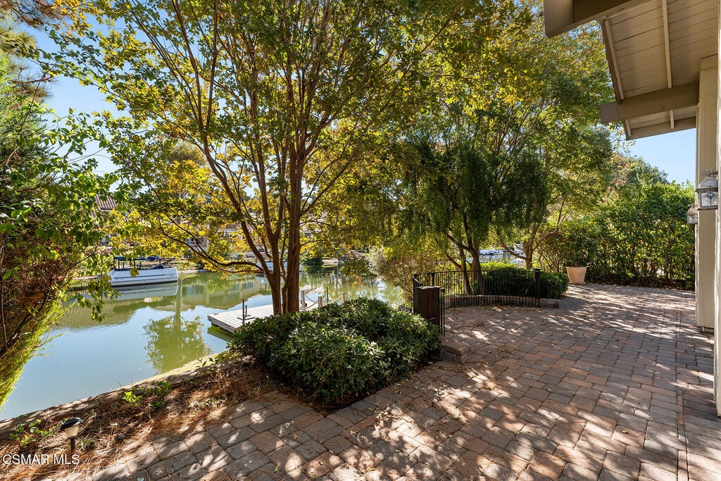 Westlake Village lakeside living at it's best...RARELY AVAILABLE SINGLE STORY on a serene cul-de-sac in a prime location 4 homes from the main channel. Surrounded by million dollar homes, this light and bright home features a very open and inviting 2 bedroom/2 bath floorplan. Designer touches are everywhere with its neutral colors, stone and hardwood flooring, crown molding and built in bookcases. The spacious main living room has a fireplace and wall of windows with spectacular views of the lake. In the kitchen you will find custom cabinetry with Corian countertops, built in desk and eat in area. The master bedroom includes a fireplace, skylights and a private patio just off the slider. Outside you will love the custom hardscaping providing plenty of sitting areas and room to entertain, with lots of privacy from the beautifully manicured mature landscaping. Don't forget about your own private lighted dock with boat dock privileges for your boat or simply sitting out and enjoying the serenity of the water. Hurry won't last! Photos from before current tenant.