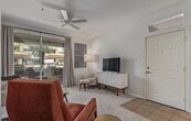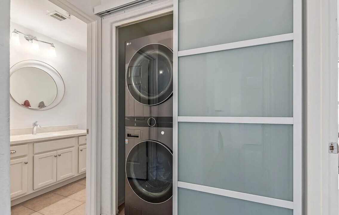 this ground-level condo offers the perfect blend of comfort and convenience. Located near the front of the complex, this inviting unit is full of charm and thoughtful upgrades. Newer plush carpet throughout creating a cozy, welcoming feel throughout. The bathroom features a custom marble-like shower enclosure, adding a touch of luxury. A convenient in-unit laundry area includes a brand new LG black stainless steel washer and dryer set, tucked neatly behind stylish barn door-style privacy doors for added charm and functionality. The bright kitchen is outfitted with crisp white appliances, a pantry for extra storage, plus all the plates and utensils to make it easy for coming and going, plus a spacious country-style sink. ideal for hiding dishes or making prep work a breeze. A cozy breakfast nook with its own window offers the perfect spot to enjoy your morning coffee. Step outside to your private patio, ideally situated just across from the clubhouse and only a few steps to the community pool, spa, and fitness center