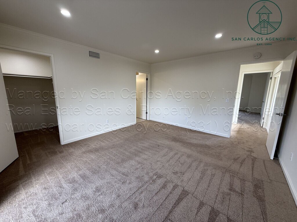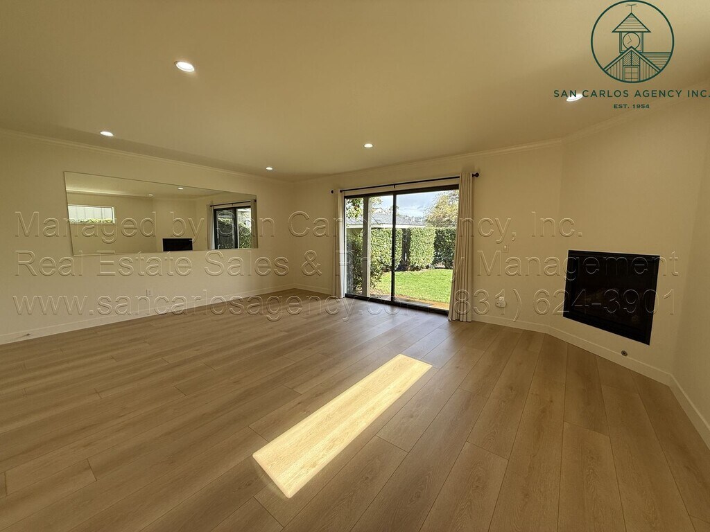 (BOHLD I/O) San Carlos Agency, Inc. offers this newly remodeled and beautifully updated two bedroom, two and one-half bath end unit condominium townhouse at the highly coveted and very convenient Arroyo Carmel complex. The unit overlooks the large lawn area, pond, and is only steps away from the HOA-managed, shared pool. The ground level has new flooring, a spacious living area with gas insert fireplace, a dining area adjacent to the kitchen, a half bath (with stackable washer dryer left as a courtesy to tenant), and under-stairs storage area. The kitchen is lovely with plenty of cabinetry, refrigerator with freezer drawer and ice-maker, electric dual fuel range (electric cook-top/gas oven) with built-in microwave vent hood, large sink with disposal, dishwasher, and pantry. The adjacent dining area exits to the detached double car garage. Upstairs is two primary suites, both with walk-in closets, patio decks, and en-suite baths (one walk-in shower and the other a tub/shower combo). In addition to the pool, there are other HOA amenities. Tenant pays all standard utilities. Additional parking close to unit. Small pet negotiable. No smoking. Contact San Carlos Agency, Inc. at or to schedule a showing. Visit or