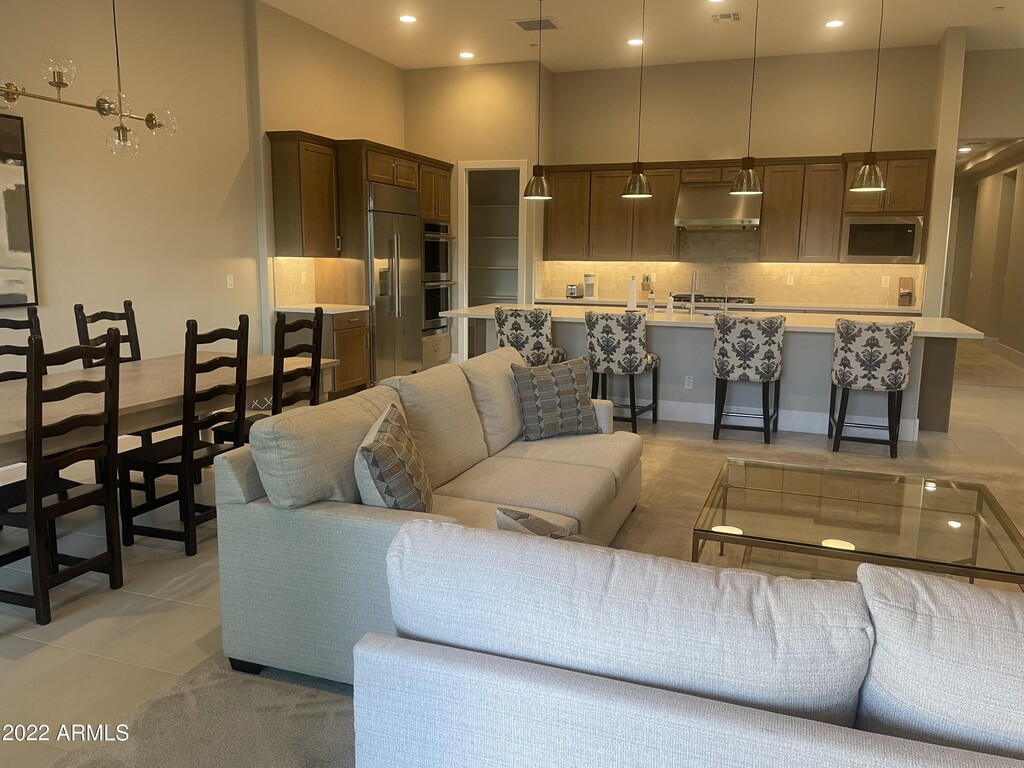 AVAILABLE NOW until November $3,500/month. 4,600 Annual February! Enjoy this beautiful NEW open air gem. Boasting 12' ceilings,newly furnished 3bd 2ba. Clean,quiet and relaxing! Huge Gourmet kitchen,beautiful high-end appliances,quartz countertops,Luxury Master Bedroom and Bathroom. Office,desk,Large screen TV,wifi,new washer/dryer,Soft water,osmosis drinking water. Private covered backyard patio,outdoor fireplace,attached 2 car garage,Tesla 220V charger. New Community Pool,Hot tub,Gym,Covered outdoor BBQ's,Dog Park,Pickle ball. Located just steps from Cave Creeks vibrant restaurants,bars,music,shopping,library,hike,bike,rodeos,horse riding,off roading and nearby Golf! Don't miss out on this unique opportunity!