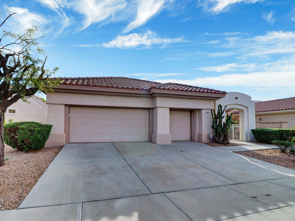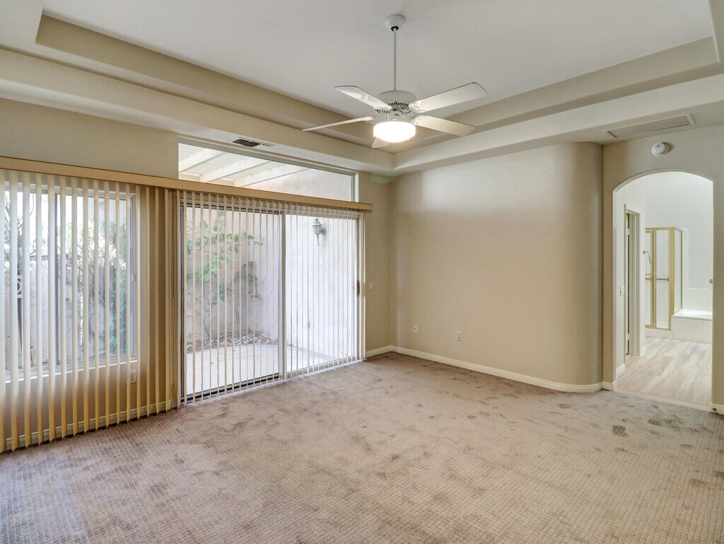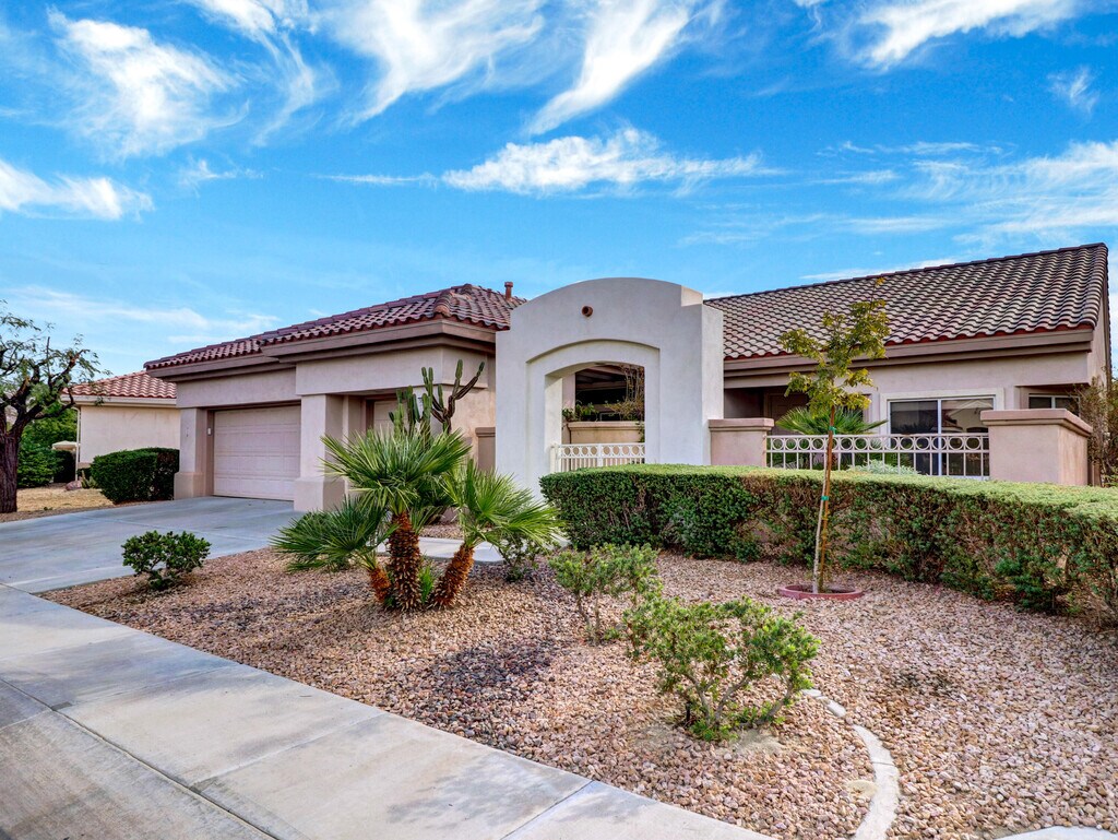 Annual lease in Sun City,the premier 55+ community in Palm Desert. This rare Solitair model has over 2100 square feet with 12 foot ceilings,a kitchen family room combination and breakfast nook overlooking the private park like fully fenced back yard. Nicely landscaped rear patio with shady covered area. Brand new decorator paint,coordinated new carpet,and wood look tile floors in all traffic areas. The huge garage is bigger than some houses with a wall of cabinets,storage shelves and an extra fridge included. The large laundry room has a wet sink and even a garden window for your indoor plants. Formal Living/Dining room with special ceiling touches and another view of the yard and patio. The primary bedroom with massive organized closet and private zen patio,large shower and jetted tub compliment the double sink/make up table. The guest wing has a beautiful front den/study/bedroom overlooking the front courtyard,With a bathroom and linen closet between another bedroom overlooking the rear patio with a fantastic custom closet. Ceiling fans throughout dual AC recently replaced for trouble free comfort. Titanium Security maintains the complex with three 24/7 patrol vehicles in addition to front and rear maned gates in addition to 3 automated entrances. This home is just a walk away from the remodeled clubhouse,tennis and pickleball courts and the outdoor sports pavilion. Three clubhouses,4 pools (one indoor) two fully equipped fitness centers one with an indoor track for year round exercise keep you in shape. Two championship golf courses,two pro shops,20 station driving range (balls included),world class practice facilities,and a natural grass putting course rounds out the golf. 80 clubs that will keep you busy,three restaurants (one is a brand new sports bar) to keep you happy and well fed,a 200 seat movie theatre and a 600 seat playhouse/ballroom with entertainment fit for royalty. Be as busy as you like or enjoy the ultimate relaxing home and yard. Welcome
