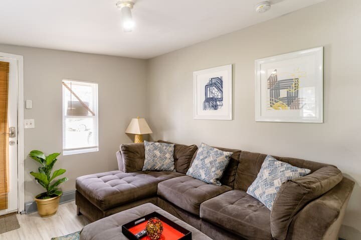 This updated ranch-style cozy home is perfect to relax nestled on its private lot. Luxury vinyl tile throughout. Featuring a fully equipped kitchen. Fully furnished with a comfortable couch in the family room, Queen size beds in both decorated bedrooms. High-speed wifi included, The back cozy deck is great for enjoying nature with a good book. This bungalow home is nestled on a 2-acre lot in SE Dekalb area. Secluded for the perfect dose of relaxation and security.