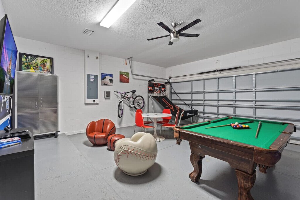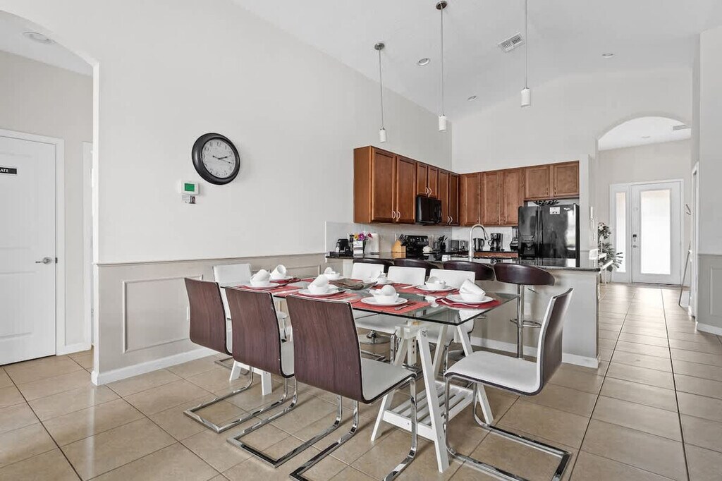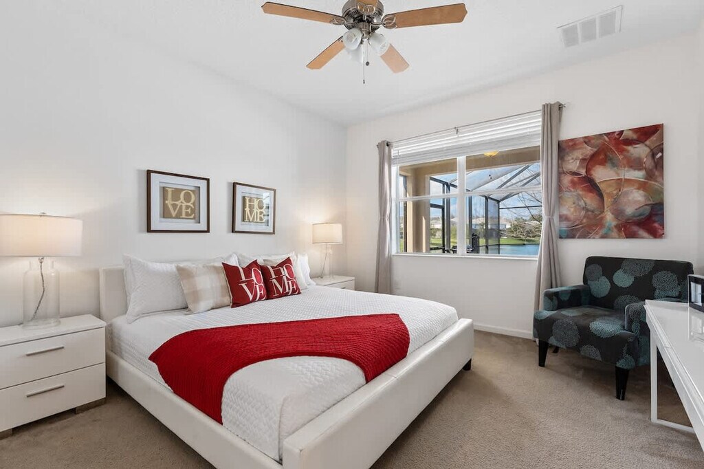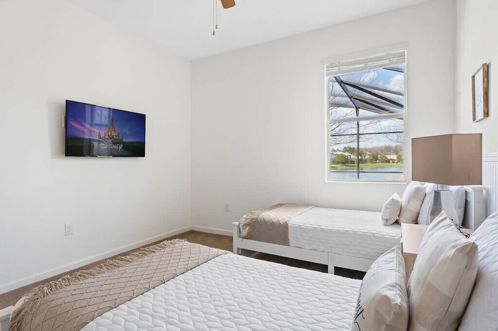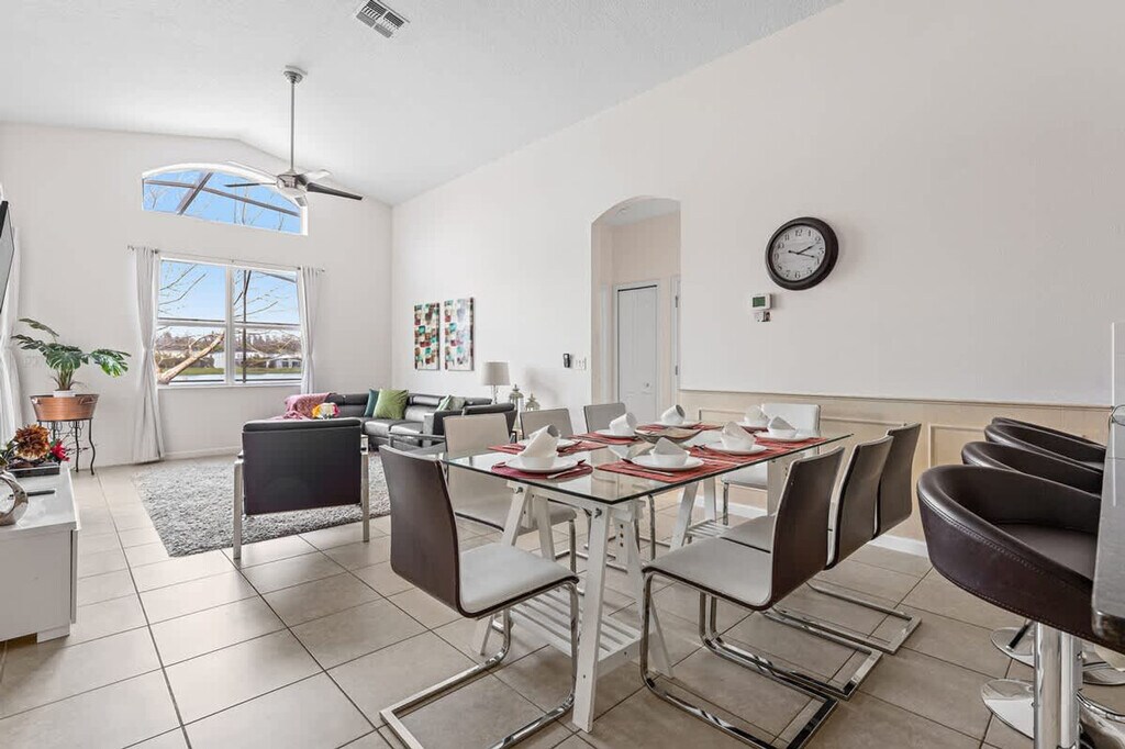 Enjoy your vacation time and allow some rest and deep relaxation with this amazing lake view property. Accommodating up to 9 guests, this home features 4 bedrooms and 3 bathrooms, offering a serene retreat for families or groups. The property is equipped with a game room and a private pool, ensuring entertainment and leisure during your stay. The apartment boasts a comprehensive entertainment set-up with a 55'' TV in the game room, a smart 65'' TV in the living room, and 42'' TVs in all bedrooms. Stay connected with high-speed Wi-Fi provided by Spectrum, offering up to 1 Gig speed. The property is pet-friendly, with a non-refundable pet fee of $250 for one pet and $150 for each additional pet. The private pool and spa can be heated for an additional fee, providing a relaxing oasis for guests. Optional extras and concierge services are available but not included in the reservation price. These include pet fees, pool heater, grill rental, early check-in, late check-out, and mid-stay cleanings. Prices and availability can be checked upon request. Baby items such as a Pack n' Play and stroller are complimentary for all stays. Strategically located near the famous Orlando theme parks and other special attractions, this home is nestled in the Bella Vida Resort, a gated community with over 15 acres of beautiful lakes and a 6700 square feet clubhouse. Enjoy the community pool, Jacuzzi, internet cafe, arcade, sport courts, TV room, walking trails, playground, and beautiful Italian gardens. Conveniently, Walt Disney World is 8.3 miles away, Universal Orlando is 14.4 miles away, and essential stores like Walmart, Publix, Target, Walgreens, and CVS are all within a short drive. Grills are not allowed on the property. The screen doors of the pool enclosure are padlocked for safety and security, with access only for pool cleaning staff. The garage is not available for guest use as it is converted into a game room. The property is in Florida, where wildlife and pests are common; regular pest control is conducted, but sightings may occur. Check-in is at 4 PM and check-out is at 10 AM, with options for early check-in or late check-out available at additional cost. Quiet hours are between 10 PM and 8 AM. This is a self-catering home with a basic starter kit provided, but guests should bring or buy additional items as needed. A laptop computer is not included. [SI]