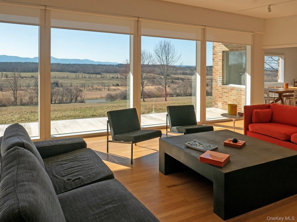 Enjoy this beautiful mid-century home high on a hill with expansive Catskill views,10 minutes to Hudson,now available year round. Originally built in 1957,to the highest standards,this completely updated home has been stylishly renovated and furnished by the new owner (a prominent professional design expert) using the best interpretation of mid-century modern style. Located high above a quiet country road,chosen for outstanding Catskill views and overlooking open farm fields bordered by hedge rows with mature trees,the home’s new energy-efficient windows have been strategically expanded to bring inside the spectacular outside views. The original core living room,kitchen and den of the house have been combined to a huge open space around the spectacular wood-burning fireplace with floor-to-ceiling windows to the west,a huge central kitchen island and breakfast area behind the fireplace. All walls,ceilings,doors,windows have been refurbished with bright,clean,sleek surfaces and the original oak floors were restored in all the rooms. The primary bedroom with fresh,modern ensuite bath has the vast westerly view,while the two guest bedrooms share another modern bathroom and have south and east views of the surrounding woods and fields. On the lower level are storage and playrooms,complete with ping pong and foosball tables,a long wall of bookshelves,and the utility room with up-to date equipment,including water filters,geothermal energy and air exchange systems that provide sustainable clean and healthy heating and cooling. Set on five quiet and private acres,yet only 10 minutes to thriving Hudson with restaurants,shops,and galleries,as well as Amtrak. Two hours NYC. Flexible rental term considered. Based on information submitted to the MLS GRID as of [see last changed date above]. All data is obtained from various sources and may not have been verified by broker or MLS GRID. Supplied Open House Information is subject to change without notice. All information should be independently reviewed and verified for accuracy. Properties may or may not be listed by the office/agent presenting the information. Some IDX listings have been excluded from this website. Prices displayed on all Sold listings are the Last Known Listing Price and may not be the actual selling price.