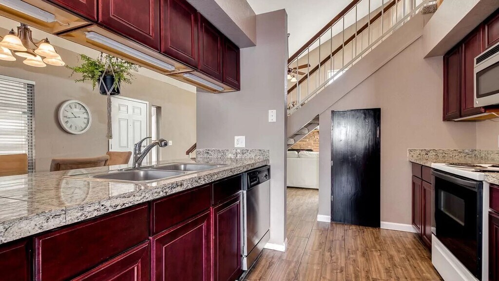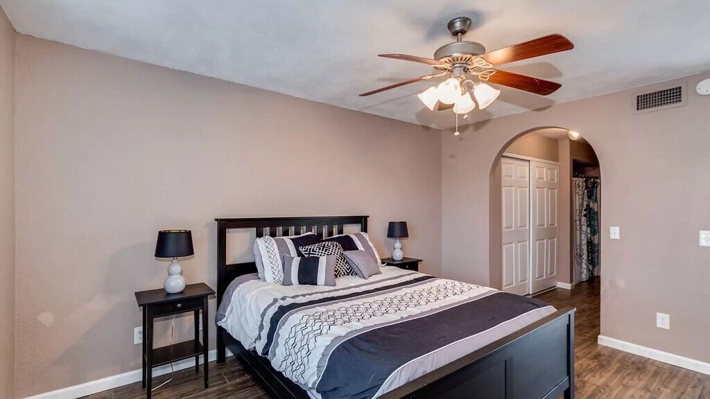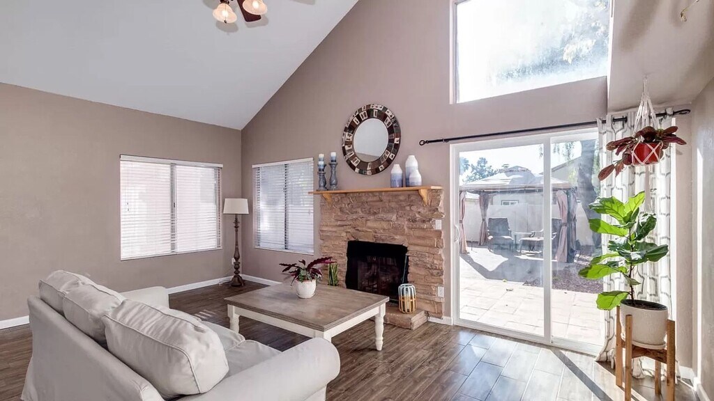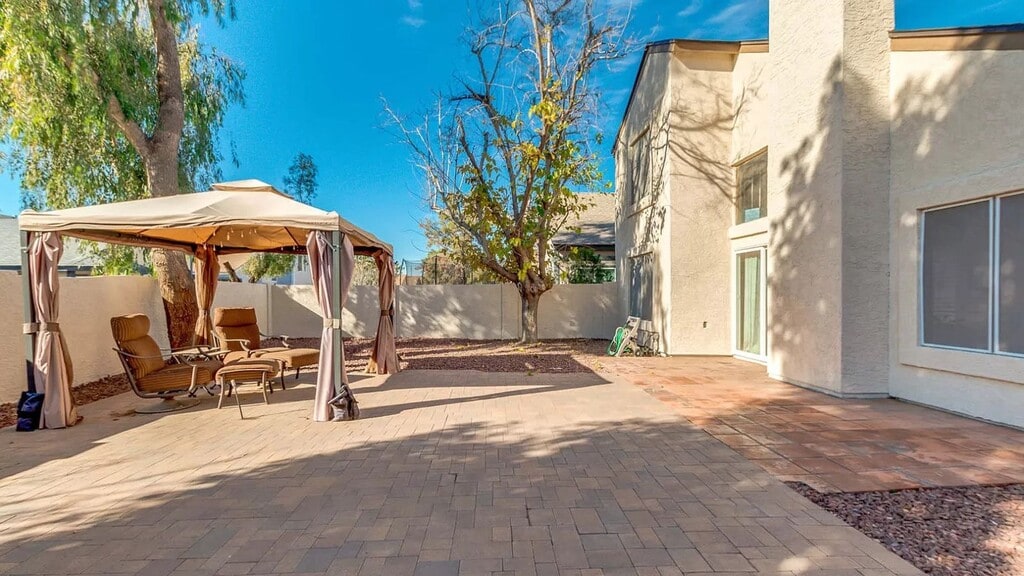 Spacious Two Story 2 Bedroom, 2.5 Bath Home with Large Open Loft and Attached Two Car Garage located in the Hearthstone Neighborhood, near Chandler Blvd and McClintock. View Virtual Tour: Kitchen with Granite Counters includes a Built-in Microwave, Dishwasher, Refrigerator and Electric Range. Overhead and under cabinet lighting with a bar for additional seating on the dining room side. Downstairs Master Bedroom Suite with Shower and Bathtub. Downstairs Powder Room. Newly remodeled Upstairs Bathroom with Shower/Bath. Spacious Loft perfect as an office or general use room. Luxury Spanish Tile flooring throughout the ground floor with Carpeted Upstairs. Enclosed backyard has plenty of space for grilling/BBQ or a cozy fire in the firepit. The portable firepit and wooden picnic table are included for use by renters. The neighborhood includes a community pool within walking distance and several grassy parks nearby. Great access to restaurants, shopping, and local businesses, while still being isolated from thru traffic. Central A/C and Forced Air Furnace. Two Car Garage. No smoking. Pets OK. Refrigerator, stove/oven, microwave, dishwasher, and laundry machines included (without warranty) Renter to pay all utilities. The monthly HOA fees are paid by the owner. Renter must comply with HOA terms and conditions. Contact Joshua to schedule showing: