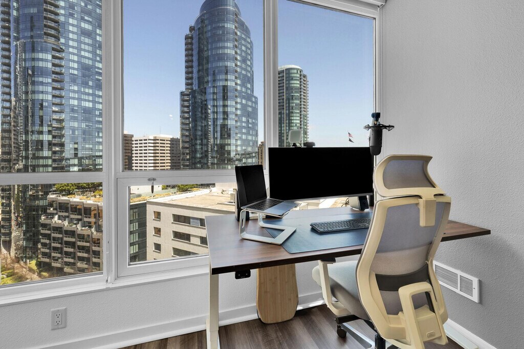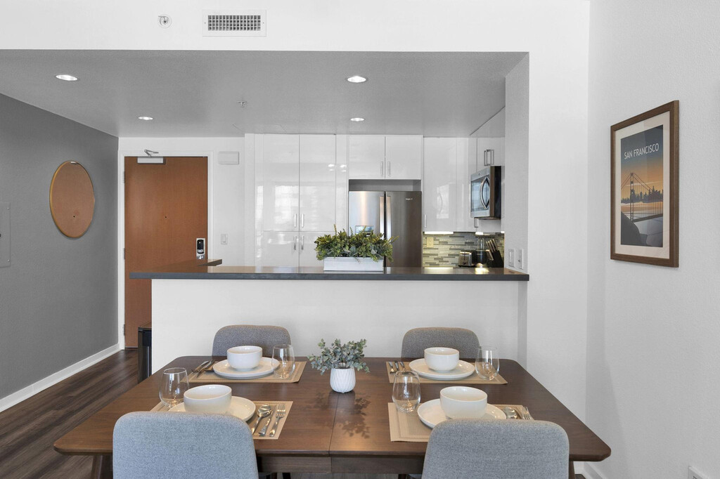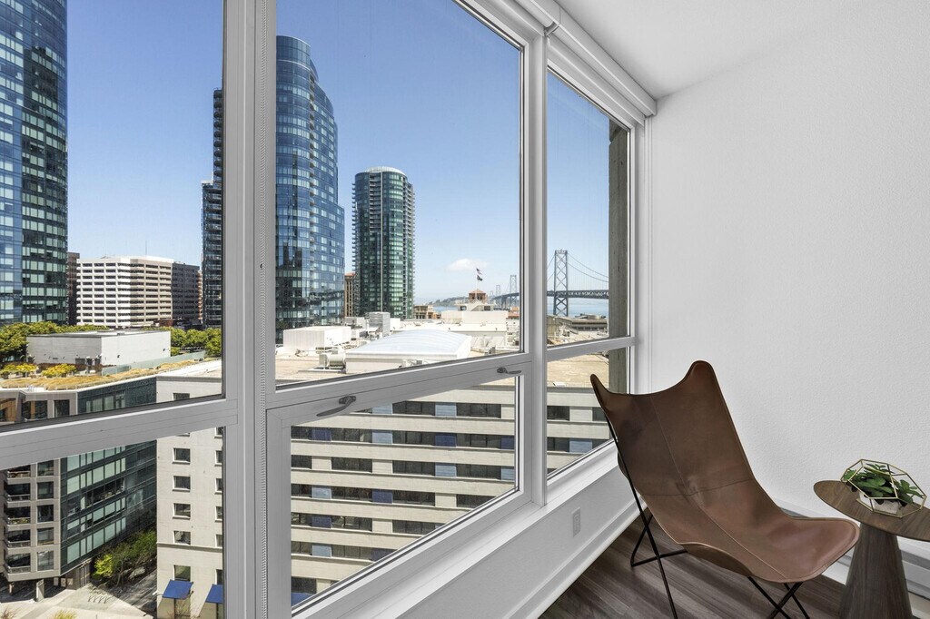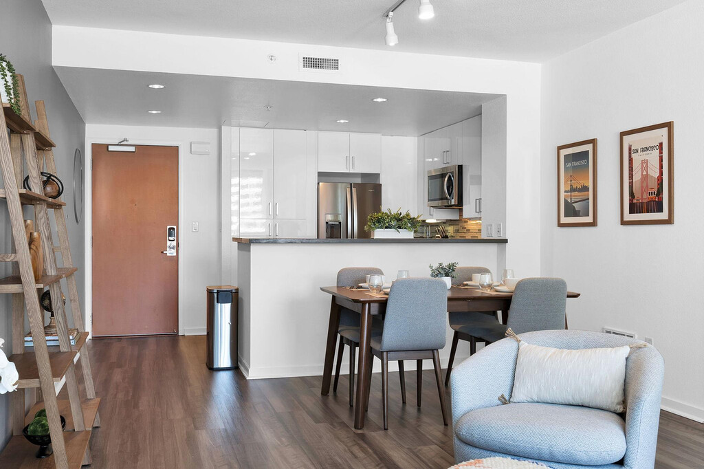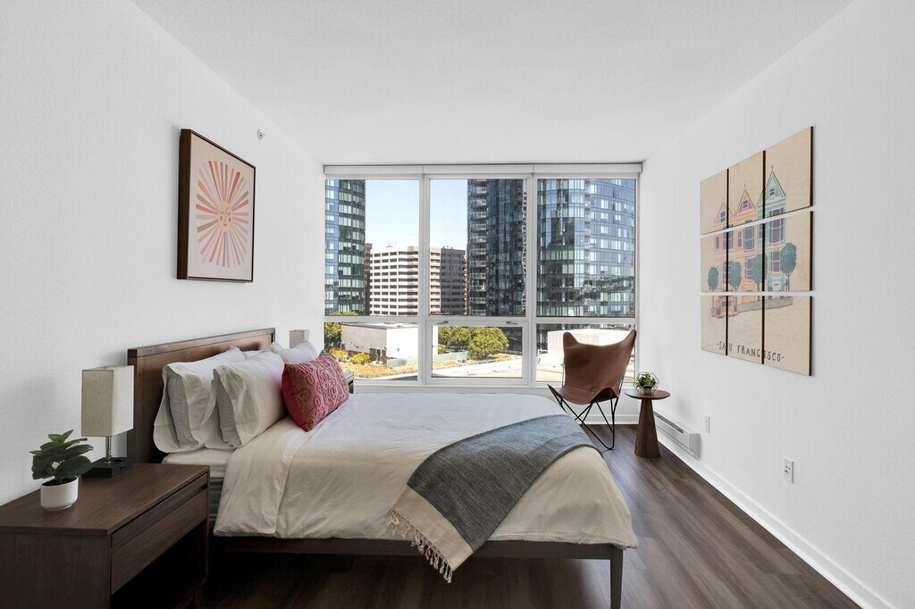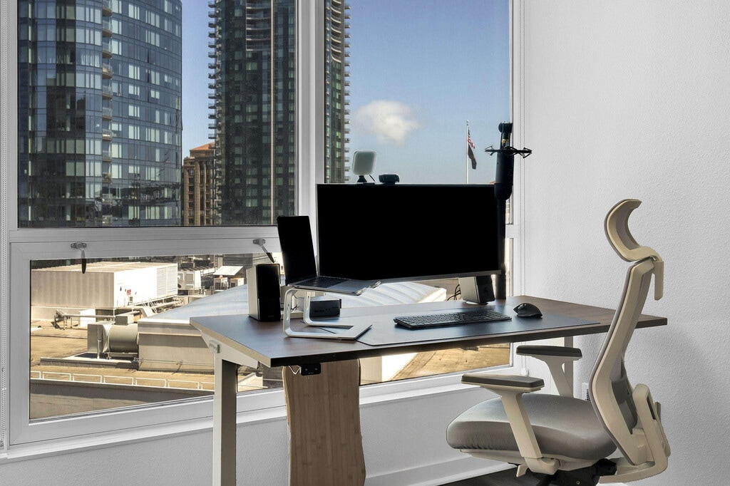 Your home in San Francisco’s downtown core, this apartment on Beale Street provides the ultimate in high-end city living. Enjoy the vibrant lifestyle of Rincon Hill and the business district right outside your door, or take a short stroll to the waterfront and explore The Embarcadero alongside the bay. With restaurants, groceries, shopping, and museums all within walking distance, you’ll have everything you need right at your fingertips. This fully furnished, 1-bedroom apartment is custom designed for the remote worker looking for a comfortable and inspiring environment in which to be productive. The unit includes a fully equipped kitchen, full bathroom, queen-size mattress, plenty of storage, smart TV, and all utilities. Most importantly, it features a full home office set-up with private high-speed internet that you won't find anywhere else. Secure garage parking starting at $400/month based on availability and storage lockers available starting at $55/month. There is no air conditioning in this unit. Internet speeds are not guaranteed and may fluctuate based on your computer model and the router location. A laptop computer is not included in the home office set-up. Early check-in from 10am-3pm will incur a fee of $75 and early check-in before 10am will incur a fee of 1 full night's rent. Late check-out from 11am-3pm will incur a fee of $75 and late check-out after 3pm will incur a fee of 1 full night's rent. Late check-outs must be requested at least 48 hours in advance. Includes private high-speed internet, standing desk (Uplift), ergonomic work chair (Uplift), 34-inch ultra-wide monitor (Samsung), microphone (Blue Yeti), webcam (Logitech), computer speakers (Bose), LED streaming light, green screen, keyboard (Logitech), mouse (Logitech), laptop stand, and TOTU 16-in-1 Triple Display USB-C 3.1 Docking Station.