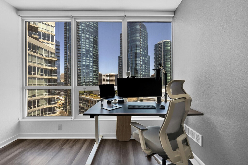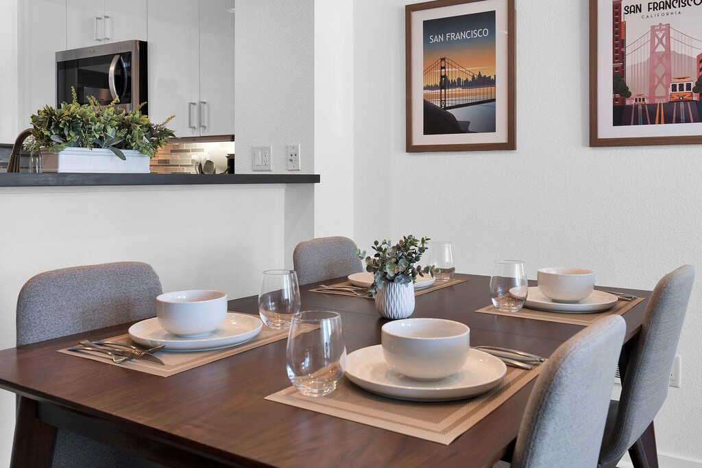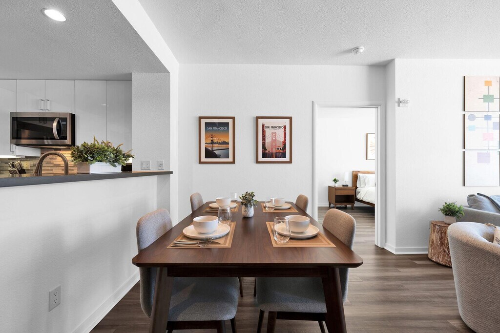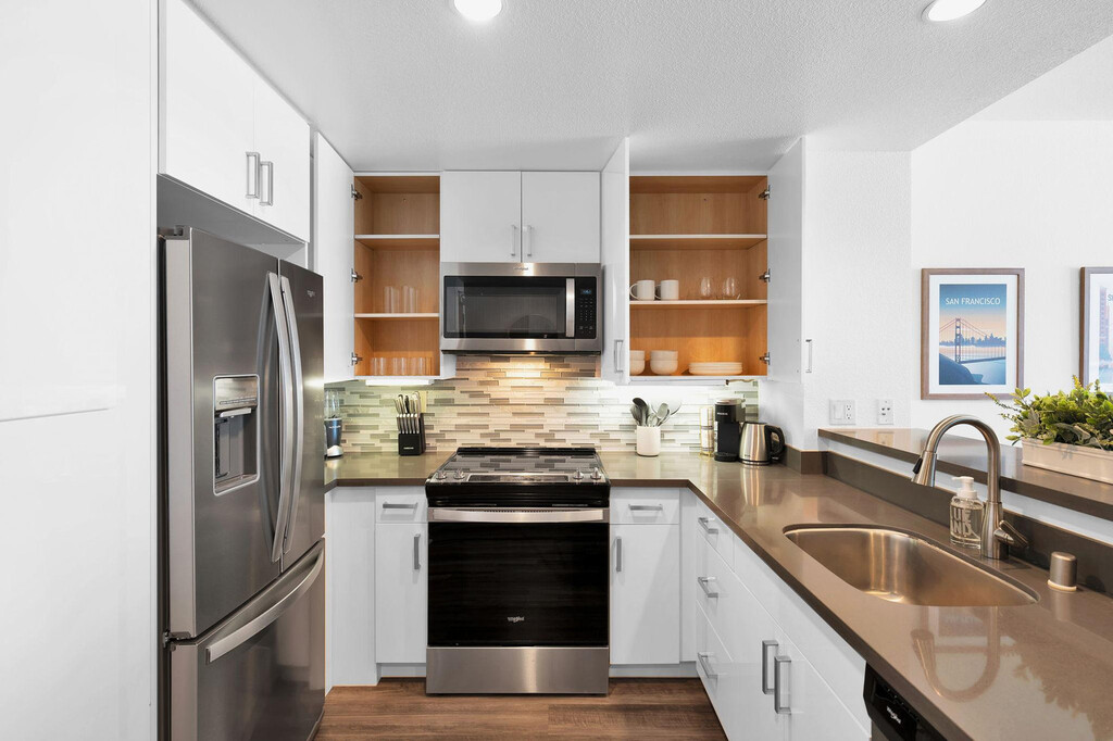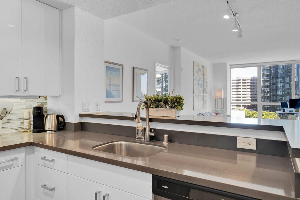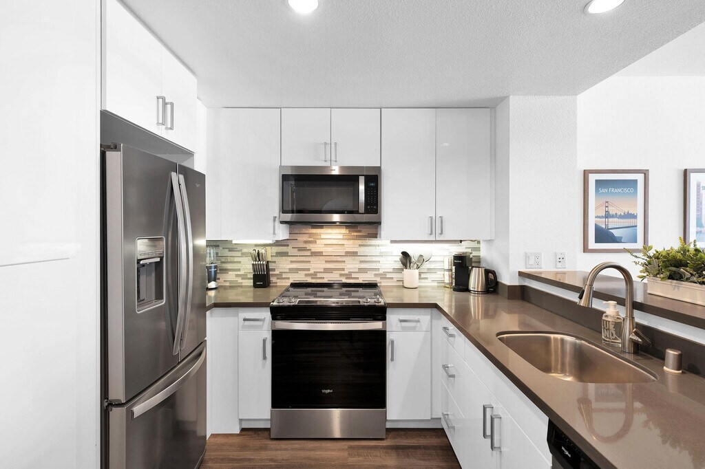 Your home in San Francisco’s downtown core, this apartment on Beale Street provides the ultimate in high-end city living. Enjoy the vibrant lifestyle of Rincon Hill and the business district right outside your door, or take a short stroll to the waterfront and explore The Embarcadero alongside the bay. With restaurants, groceries, shopping, and museums all within walking distance, you’ll have everything you need right at your fingertips. This fully furnished, 1-bedroom apartment is custom designed for the remote worker looking for a comfortable and inspiring environment in which to be productive. The unit includes a fully equipped kitchen, full bathroom, queen-size mattress, plenty of storage, smart TV, and all utilities. Most importantly, it features a full home office set-up with private high-speed internet that you won't find anywhere else. Secure garage parking starting at $400/month based on availability and storage lockers available starting at $55/month. There is no air conditioning in this unit. Internet speeds are not guaranteed and may fluctuate based on your computer model and the router location. A laptop computer is not included in the home office set-up. Early check-in from 10am-3pm will incur a fee of $75 and early check-in before 10am will incur a fee of 1 full night's rent. Late check-out from 11am-3pm will incur a fee of $75 and late check-out after 3pm will incur a fee of 1 full night's rent. Late check-outs must be requested at least 48 hours in advance. Includes private high-speed internet, standing desk (Uplift), ergonomic work chair (Uplift), 34-inch ultra-wide monitor (Samsung), microphone (Blue Yeti), webcam (Logitech), computer speakers (Bose), LED streaming light, green screen, keyboard (Logitech), mouse (Logitech), laptop stand, and TOTU 16-in-1 Triple Display USB-C 3.1 Docking Station.