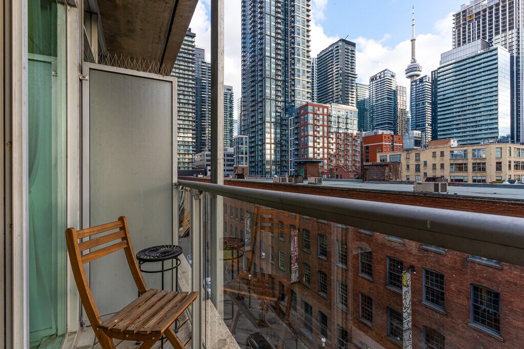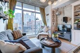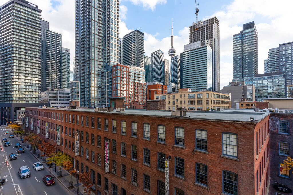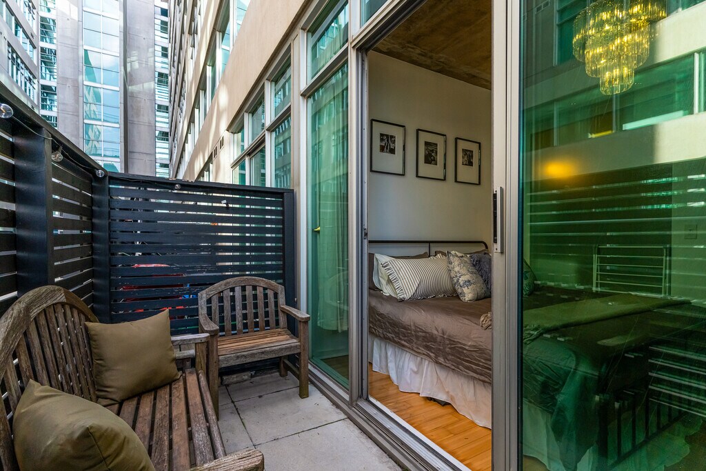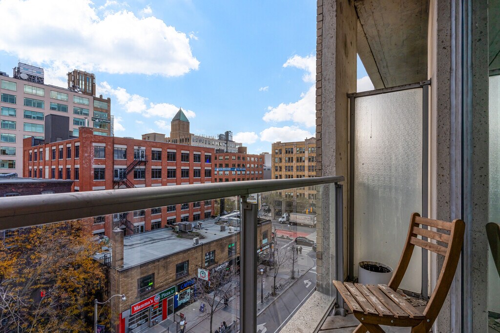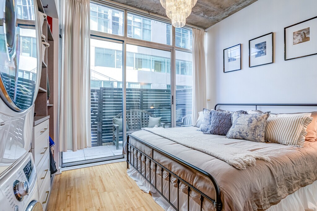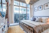 Exceptional two-storey loft at District Lofts, 516-388 Richmond Street West. This gorgeous and architecturally striking suite begins with its private main floor entry, offering a sense of exclusivity and separation rarely found in condo living. From this private foyer, take the staircase up to the main living level, where soaring ten foot ceilings, dramatic floor-to-ceiling windows, and an impressive open-concept layout create a truly breathtaking space. The main level features a bright and spacious living and dining area that opens onto a balcony with unobstructed view overlooking vibrant Richmond Street, bringing in natural light and connecting you to the energy of the neighbourhood. The renovated kitchen offers full-sized appliances and excellent storage, making the space both stylish and functional. The generous bedroom provides a peaceful retreat, with large built in closet, an ensuite bath and laundry, and direct access to a private terrace-an ideal spot for morning coffee or relaxing high above the city. With two outdoor spaces, dramatic ceiling height, and an airy multi-level layout, this suite stands apart as a truly unique offering. Parking and locker are included for added convenience. Work out in the large, well-equipped gym or plan a social event in the party room. District Lofts is a boutique building in the heart of the Fashion and Entertainment District, steps to King West, Queen West, restaurants, cafés, transit, shopping, and Toronto's cultural hubs. A rarely available rental that blends design, character, and location. A stunning home ready for its next fortunate tenant.