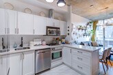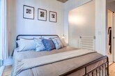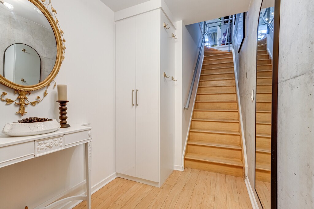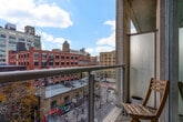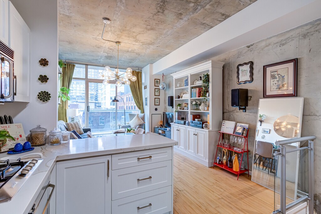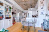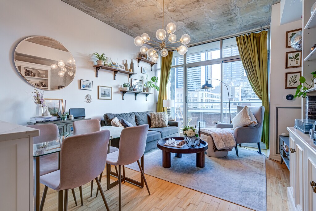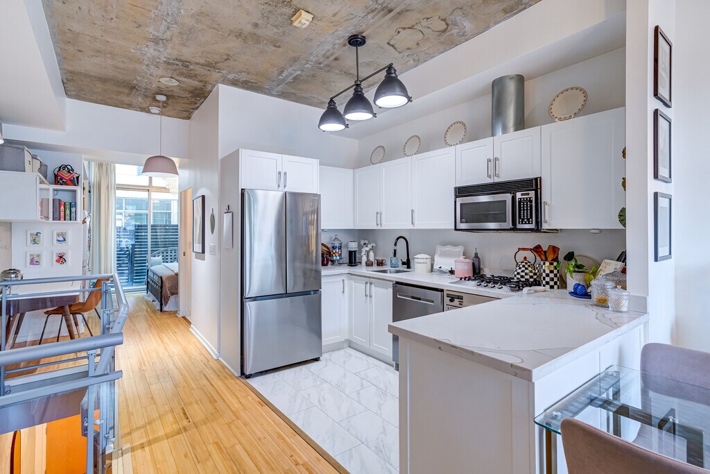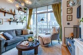 Exceptional two-storey loft at District Lofts, 516-388 Richmond Street West. This gorgeous and architecturally striking suite begins with its private main floor entry, offering a sense of exclusivity and separation rarely found in condo living. From this private foyer, take the staircase up to the main living level, where soaring ten foot ceilings, dramatic floor-to-ceiling windows, and an impressive open-concept layout create a truly breathtaking space. The main level features a bright and spacious living and dining area that opens onto a balcony with unobstructed view overlooking vibrant Richmond Street, bringing in natural light and connecting you to the energy of the neighbourhood. The renovated kitchen offers full-sized appliances and excellent storage, making the space both stylish and functional. The generous bedroom provides a peaceful retreat, with large built in closet, an ensuite bath and laundry, and direct access to a private terrace-an ideal spot for morning coffee or relaxing high above the city. With two outdoor spaces, dramatic ceiling height, and an airy multi-level layout, this suite stands apart as a truly unique offering. Parking and locker are included for added convenience. Work out in the large, well-equipped gym or plan a social event in the party room. District Lofts is a boutique building in the heart of the Fashion and Entertainment District, steps to King West, Queen West, restaurants, cafés, transit, shopping, and Toronto's cultural hubs. A rarely available rental that blends design, character, and location. A stunning home ready for its next fortunate tenant.