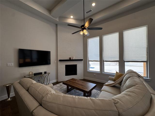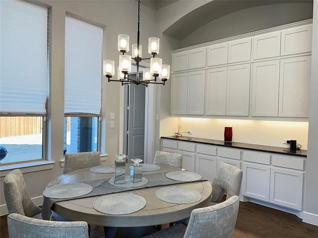 Beautiful Highland Homes single-story located in the prestigious Windsong Ranch community. This stunning home features soaring ceilings, abundant natural light, and an open-concept layout designed for both comfort and style. Engineered wood flooring and designer lighting flow throughout the main living areas, creating a warm and elegant atmosphere. The gourmet kitchen offers a large center island, quartz countertops, stainless steel appliances, custom cabinetry, and ample storage—ideal for entertaining or everyday living. The spacious primary suite serves as a true owner’s retreat, featuring vaulted ceilings, abundant natural light, and a private sitting area perfect for relaxation or reading. The spa-like primary bathroom includes dual vanities, an oversized walk-in shower, a soaking tub, and a generous walk-in closet. Secondary bedrooms are well-sized with high ceilings, and a dedicated office or flex room provides the perfect work-from-home space. The thoughtfully designed laundry room includes cabinetry and a utility sink for added convenience. Situated on a desirable corner lot, the home offers added privacy and curb appeal. Enjoy outdoor living under the covered patio and a spacious backyard. The three-car garage is equipped with an EV charging station. Located in Windsong Ranch, one of North Texas’ most sought-after master-planned communities, offering resort-style amenities including the Crystal Lagoon, trails, parks, fitness center, tennis courts, and top-rated Prosper ISD schools. Blinds will be installed prior to move in.