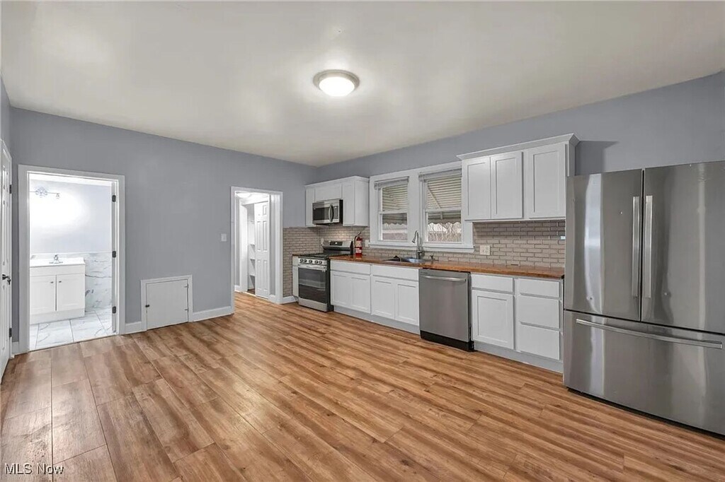 Welcome to this fully updated and move-in ready home located on Cleveland’s east side. This property has been thoughtfully renovated throughout and offers a clean, modern feel with comfortable living spaces. The home features fresh neutral paint, updated flooring, and modern finishes throughout. The updated kitchen includes white cabinetry, butcher-block style countertops, stainless steel appliances, and ample space for dining. The bathroom has been fully remodeled with contemporary tile, updated fixtures, and a clean, modern design. Spacious bedrooms offer good natural light and ceiling fans. The basement provides additional usable space and includes a washer and dryer for tenant convenience. Conveniently located near shopping, dining, public transportation, and major roadways, this home offers both comfort and accessibility.