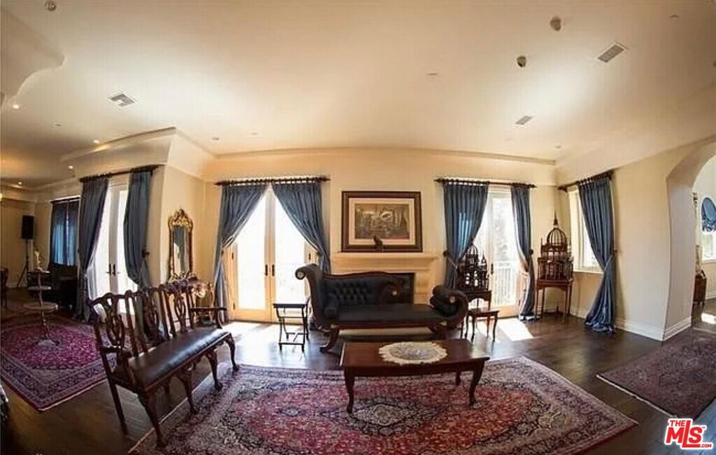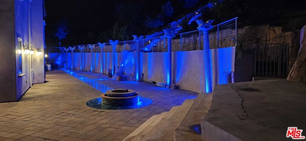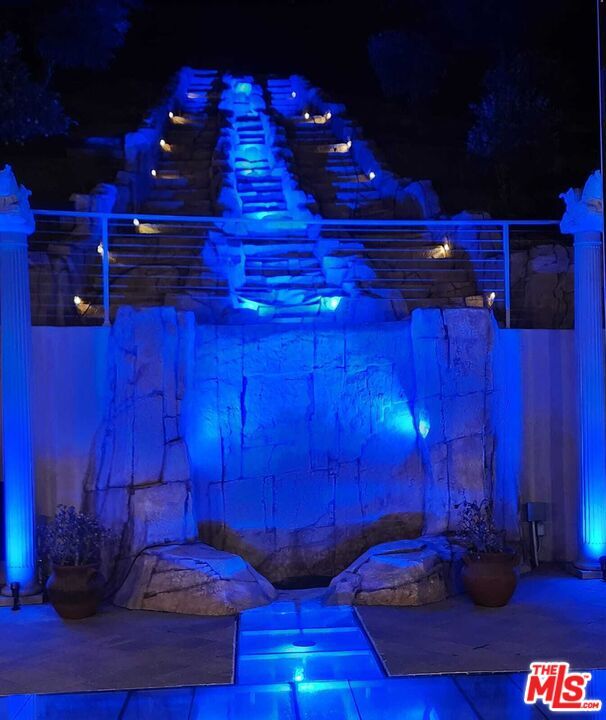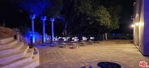 Privately situated on over one acre in a sought-after Calabasas community, this Mediterranean Contemporary residence offers nearly 6,000 square feet of living space. Built in 2013, the home features 5 bedrooms and 6.5 bathrooms with a thoughtfully designed floor plan.Interior highlights include a two-story entry, hardwood flooring, formal living and family rooms with fireplaces, dining room, bonus room, loft, and a wet bar. The primary suite offers a fireplace, walk-in closet, and full bathroom. The kitchen is designed for functionality with custom cabinetry, a large center island, pantry, stainless steel Viking appliances, and travertine finishes.The property is equipped with a security system and provides multiple spaces for entertaining. The backyard includes a built-in barbecue, mature fruit trees, waterfalls, fire pit, and a custom stage with professional audio/video wiring. Outdoor areas are designed for gatherings, performances, and recreation. Proprty is set high on a private hilltop, this estate is accessed through its own gated drive, offering both privacy and security. As you enter, a separate motor court provides parking for 8-10 vehicles. The kitchen is equipped with top-of-the-line Wolf appliances. If leased furnished, the home features hand-carved, custom designer antique furniture of exceptional quality. MLS# 25597767