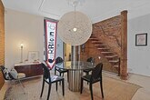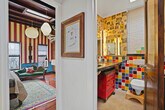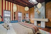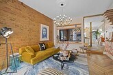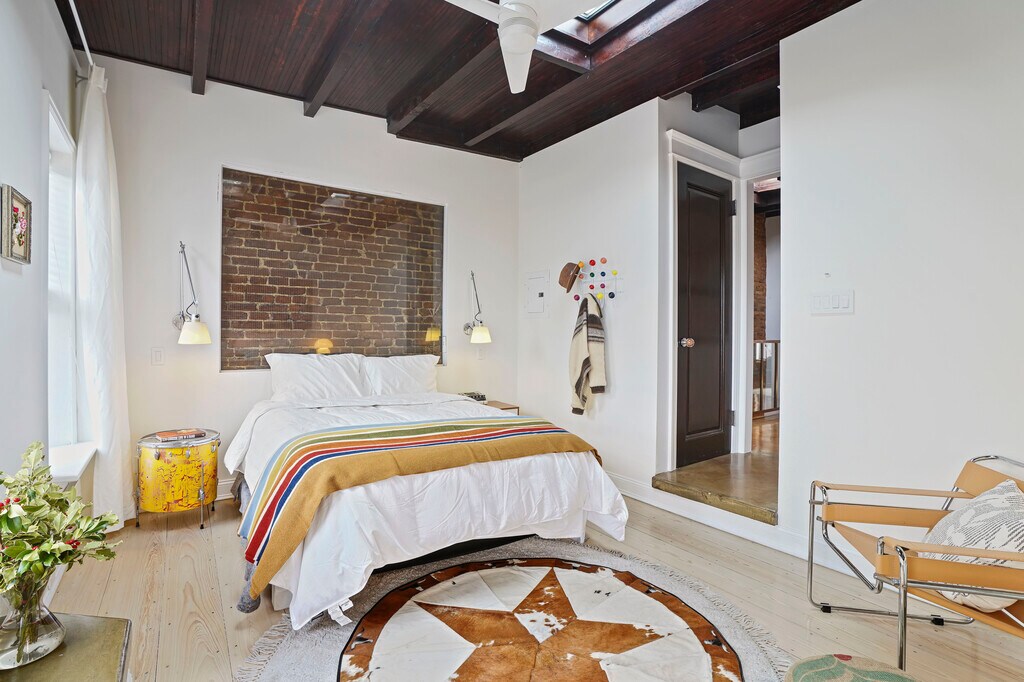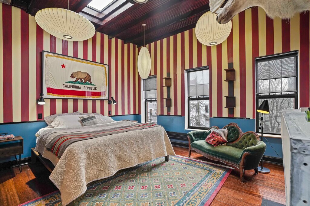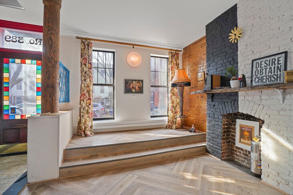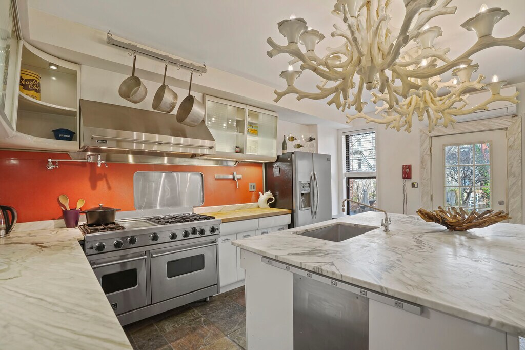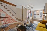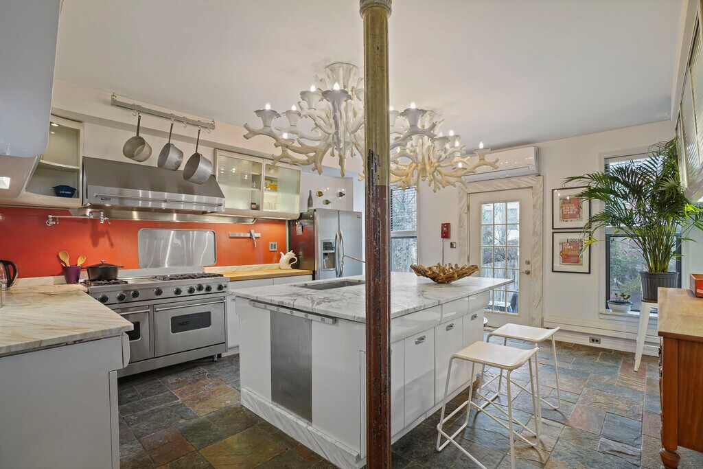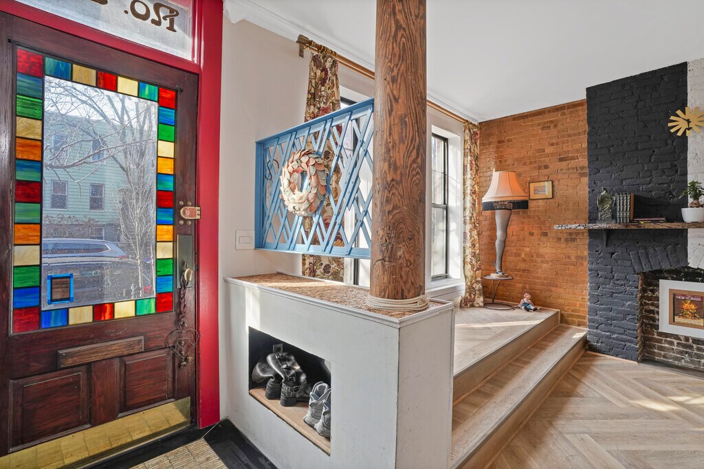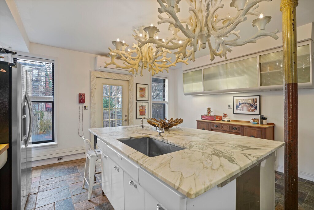 Step into a NYC-inspired residence defined by free-spirited elegance and an unmistakable sense of warmth, where uniquely inviting spaces unfold their own narratives while coming together in a seamless, comforting composition of creativity and style. From the moment you enter, the home feels both distinctive and welcoming, artful yet grounded, expressive yet effortlessly livable. Sunlight pours through this truly distinctive home, illuminating a thoughtfully curated array of architectural and artistic details that immediately put you at ease. A vivid stained-glass front door makes a memorable first impression, joined by a carefully preserved telephone-pole column sourced from Staten Island and a custom steel railing influenced by the iconic Manhattan Bridge. The herringbone-patterned living room flooring introduces understated geometric sophistication, gracefully connecting timeless elements with contemporary accents—from the black-and-white-cookie–inspired fireplace and decorative Detroit factory pillar to a Sarfatti chandelier and striking Gucci crane wallpaper. The space is further enhanced by an 85” Samsung OLED television, included with the rental, offering a refined modern contrast to the home’s artistic character. Despite its bold design, the space feels intimate and comforting, guiding you naturally into the expansive chef’s kitchen. Anchoring the kitchen, an impressive island of four thick Carrara marble slabs is thoughtfully arranged in balanced symmetry, opening to peaceful backyard views across rare, original West Side cobblestones. A professional Viking range pairs beautifully with restored 1940s Bronx Bakery cabinetry, creating a kitchen that feels both inspired and inviting—equally suited for quiet mornings and lively gatherings. The second level exemplifies versatile, modern living with a calming, open ambiance. Bathed in natural light, it balances organic textures with refined design, featuring the iconic Moooi Random Light and the Currican light sign, once glowing above audiences at the owner’s Manhattan theatre company. The intelligently divided layout includes a front sleeping area discreetly positioned behind a partition, flowing into a flexible room with a home-office nook and bar. Toward the rear, a pristine full bathroom sits beside a tranquil meditation or yoga space, offering a sense of retreat and ease. Designed with adaptability in mind, this floor evolves effortlessly to suit your lifestyle. On the top floor, the owner’s adventurous spirit comes to life beneath skylights that flood every room with natural light, creating an atmosphere that feels both expansive and serene. A Caribou elk head presides over the working fireplace, reflecting the dignified character of a home grounded in history. Ten-foot mahogany ceilings and a bold decorative wall painting introduce artistic warmth and expressive charm, while still maintaining a deeply comfortable, lived-in feel. The level is complemented by a 2025 65” Sony Bravia television, included with the rental, seamlessly integrated into the space. The adjoining bathroom captivates with a handcrafted collage of vintage photographs and a vibrant stained-glass installation, evoking nostalgia and wonder. Industrial refinement defines the landing, with concrete flooring, iron-and-glass railings, and statement designer lighting leading to a serene bedroom accented by exposed original brick, a quiet sanctuary at day’s end. Just two blocks from Prospect Park, the subway, YMCA, and the celebrated shops and dining of Park Slope, this residence is more than a place to live, it is a welcoming, one-of-a-kind living canvas of character, comfort, creativity, and inspiration. Call, text, or email to schedule your private viewing.