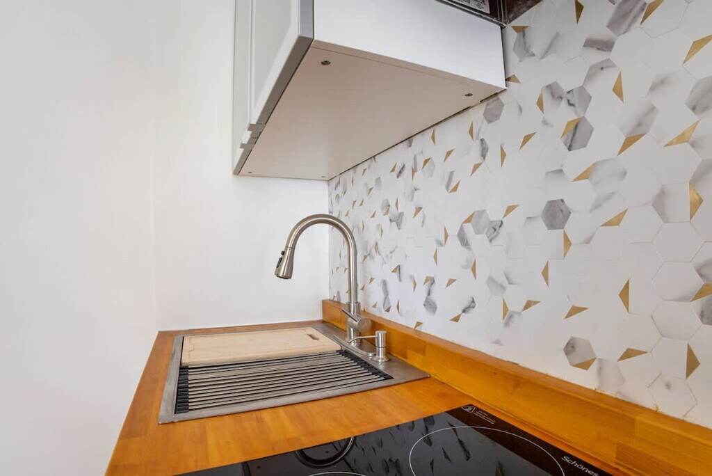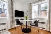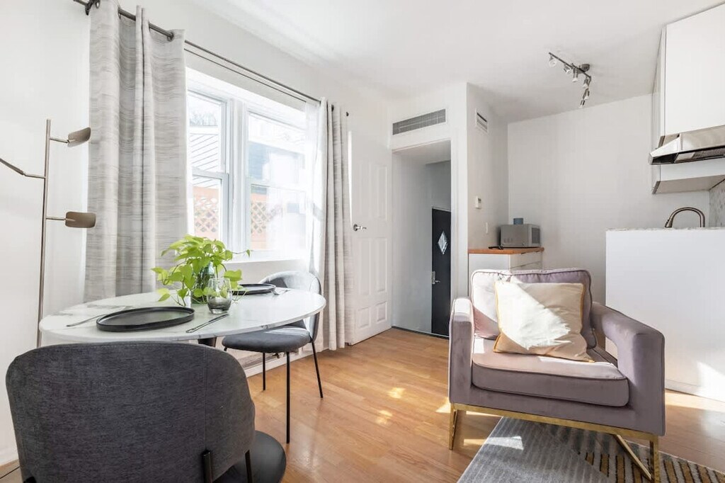 Feel at home in this peaceful and centrally located studio in Woodside, one of the most diverse neighborhoods in Queens. This cozy and recently renovated studio comfortably accommodates up to two guests. It features a kitchenette with a microwave, induction cooker, sink, small mini-bar, and modern shelving storage. There is also a dining table for two, Roku, and TV. This unique space offers a queen bed and a full bath with a stand-up shower. Additional highlights include a small home gym with exercise equipment, in-unit washer and dryer, and complimentary Wi-Fi. Access to a backyard is available for outdoor dining. Perfectly situated, this apartment is a 5-minute walk from the Sunnyside Gardens, a National Register Historic District recognized internationally as a model of urban planning. It is also a 25-minute commute to midtown NYC and Brooklyn by public transit, and a 15-minute drive from LaGuardia Airport and a 30-minute drive from John F. Kennedy Airport. Two subway options are available, including a 7-minute walk to the LIRR and proximity to many city-bike stations. A great selection of restaurants is within walking distance, including Dawa's, TJ's Bistro, The Alcove, Aubergine Cafe on Skillman Street, and Bee Cafe, Taqueria Santa Fe, Dear Han Coffee Shop, SriPraPhai, Bistro Eliose, and Arepas Cafe. This apartment requires a minimum stay of 30 days. Tenants are not allowed to bring their own high-powered appliances as it could overload the circuit. [SI]