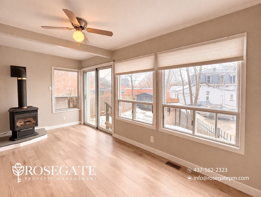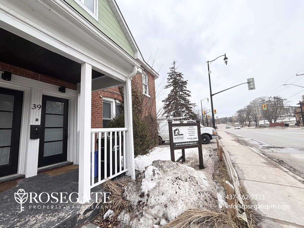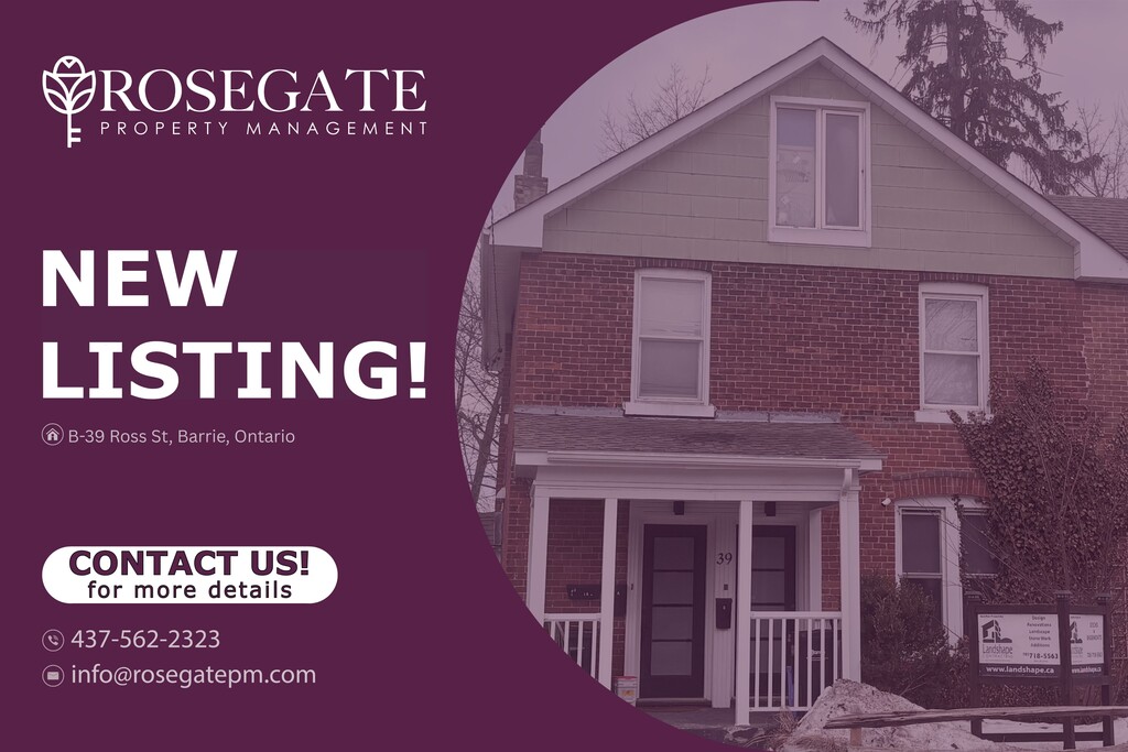 Spacious 2-Bedroom Unit with 2 Parking, Fireplace & Backyard – Barrie Welcome to B – 39 Ross Street, Barrie — a well-maintained multi-plex unit offering approximately 800 sq. ft. of comfortable living space.This 2-bedroom, 1-bathroom home features a functional layout ideal for professionals, couples, or small families seeking a cozy and practical rental.The primary bedroom includes a walk-in closet, while the living space is enhanced by a fireplace, adding warmth and character to the home.The kitchen comes equipped with white appliances, and the unit includes in-unit washer and dryer, along with central heating and air conditioning for year-round comfort.Enjoy outdoor living with a front porch, backyard, and deck, perfect for relaxing or entertaining.Parking is convenient with two dedicated parking spaces included.Located in a desirable Barrie neighbourhood close to parks, shopping, and everyday amenities, this professionally managed home offers both comfort and convenience.Book your viewing today.